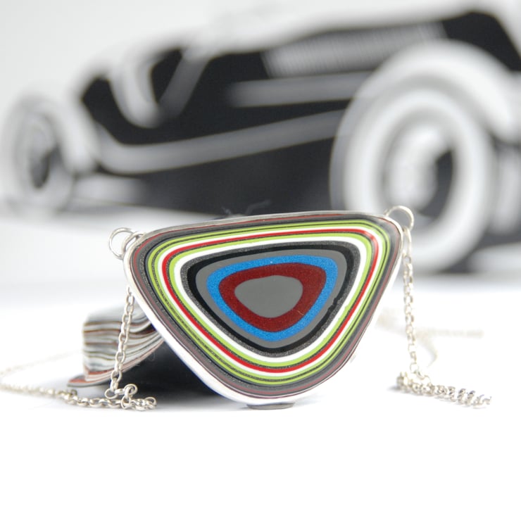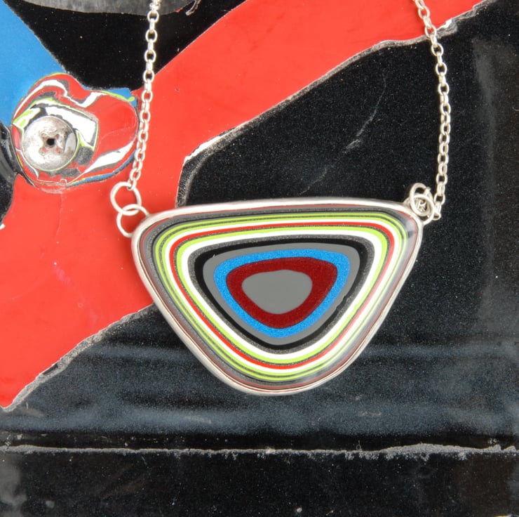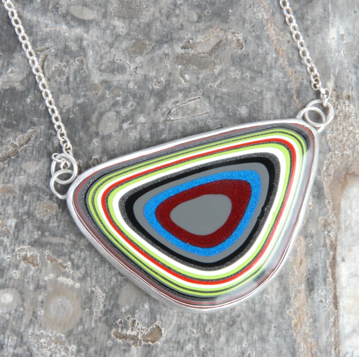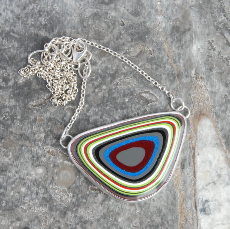 This attention grabbing necklace features a large piece of fordite (aka detroit agate) with an eye catching pattern of concentric rings in some vibrant colours. The centre is sparkly red and blue with bands of white, sparkly grey and gecko green towards the outside. The fordite is bezel set in an open back sterling silver setting so the pattern on the back can be seen however the back is predominately dark green and red. The fordite is suspended within a 20in chain with a 2 in extender.