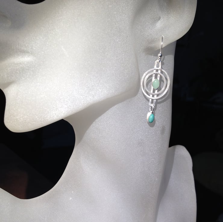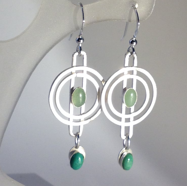 Beautiful sterling silver earrings with green Turquoise and Aventurine stones. These earrings are in the 'Gwen' circles and lines style and measure 18mm wide by 52mm from the top of the sterling ear wires to the bottom of the dangle. Lots of soldering goes into making these earrings along with careful measuring, a steady hand, and lots of love. Your earrings will be dispatched nicely packed and ready for gifting.