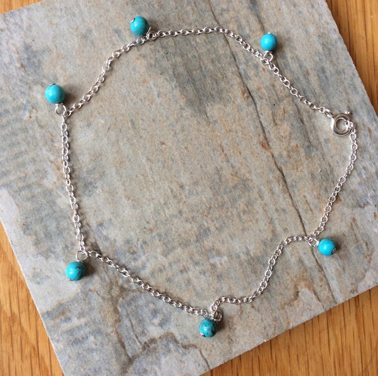 Very pretty. Sterling silver chain and clasp with Grade A Turquouse balls. This is made to 9.5 inches but can be made to any size, so please contact me, best seller, wrapped in tissue paper and in a free gift box tied with ribbon.