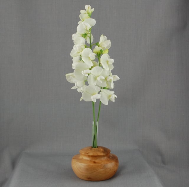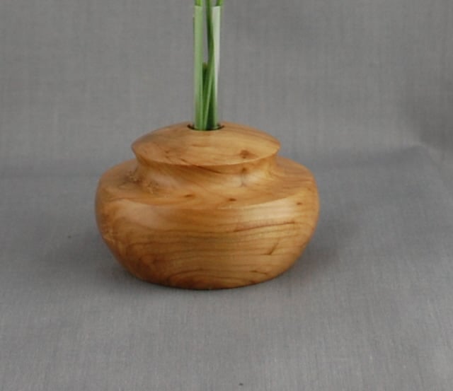 Hand turned from cherry wood, this bud vase comes complete with a glass insert, needing only to be filled with water before inserting your chosen flowers. It measures approximately 5 cm high (without the insert) and 9 cm wide.