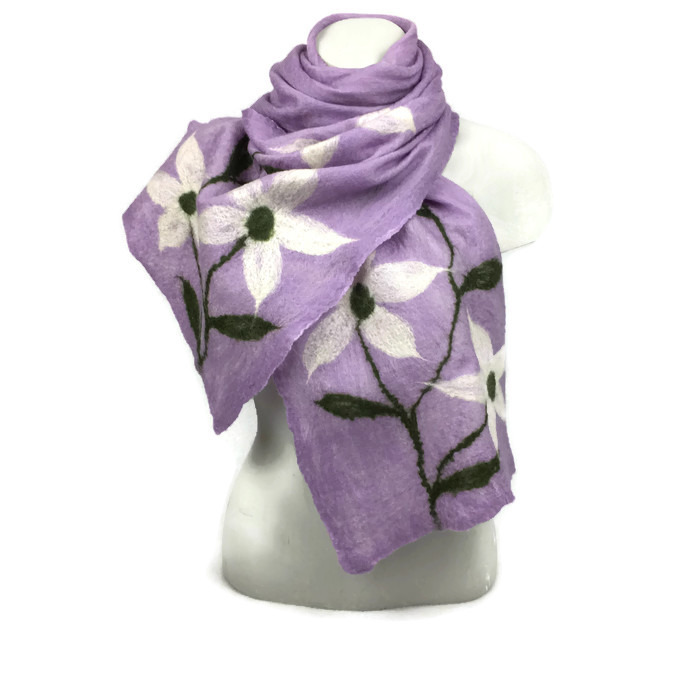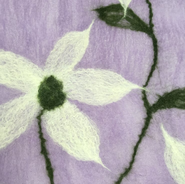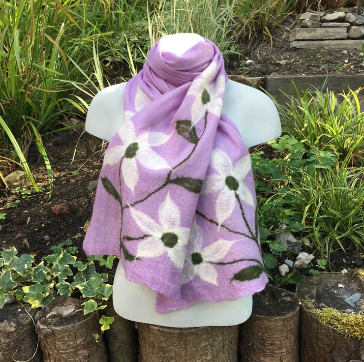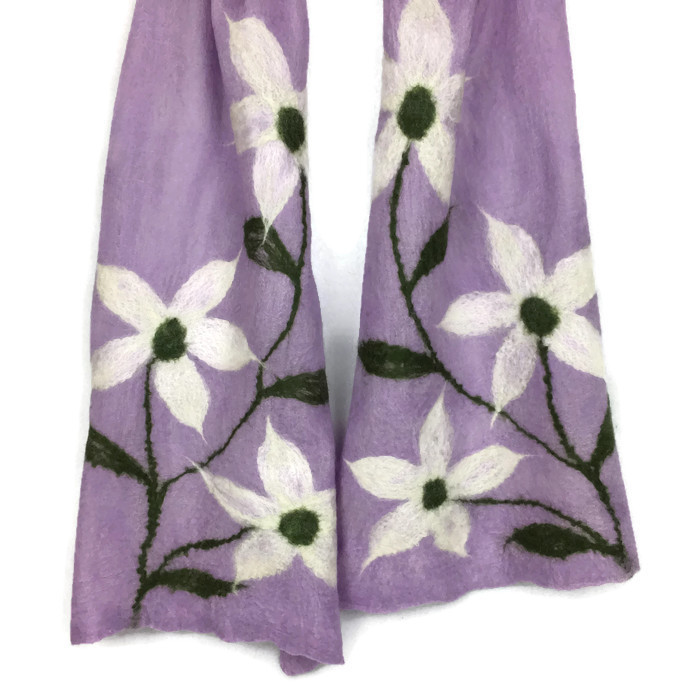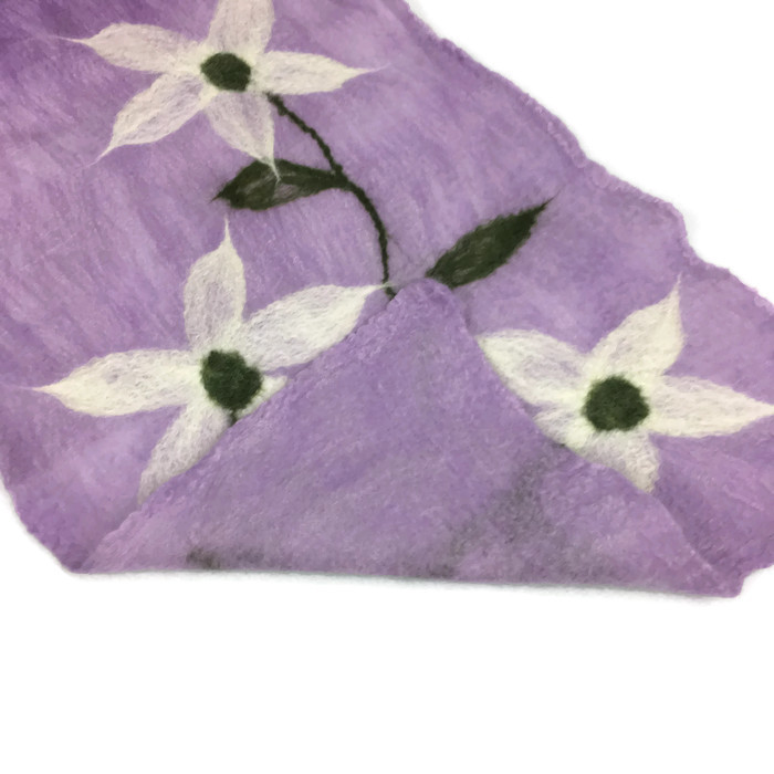 This scarf has been made using a technique known as nuno felting. Fine layers of super soft lilac merino wool have been laid in a fine layer over a lilac silk chiffon fabric, white flower detail has been added to one side and then the scarf has been nuno felted. This results in the wool fibres migrating through the silk and binding with it.