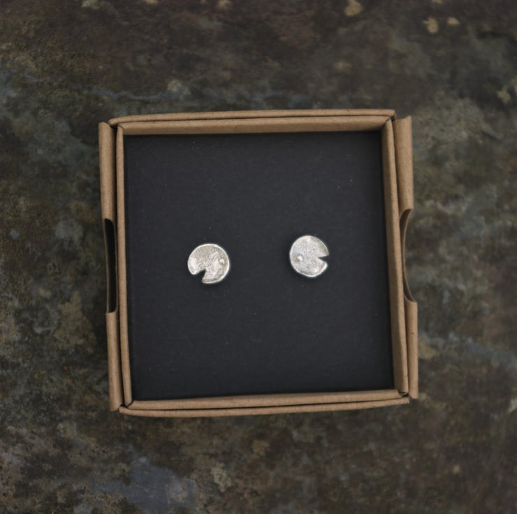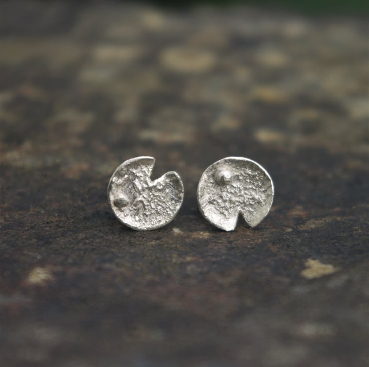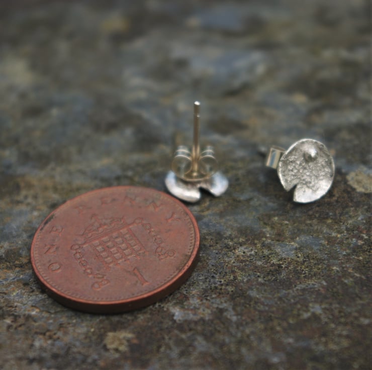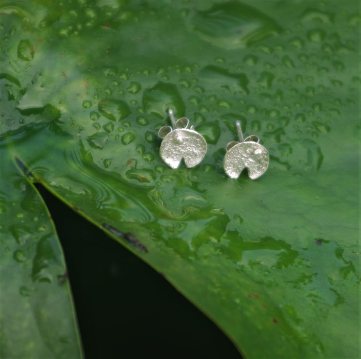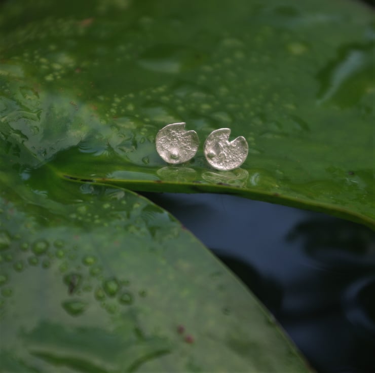I have cut out tiny lily pads from silver sheet with a diameter of 8mm/ 0.25 inches. and given the surface a texture with recycled silver dust.There is a silver raindrop on each lily pad .