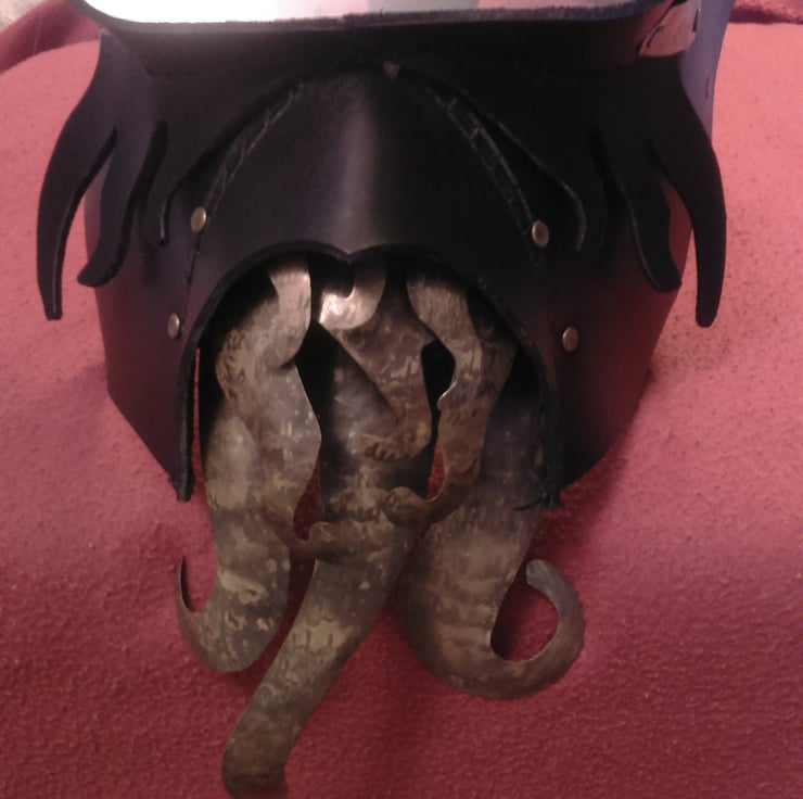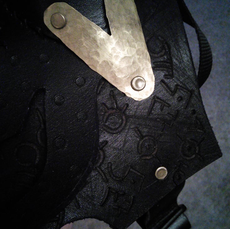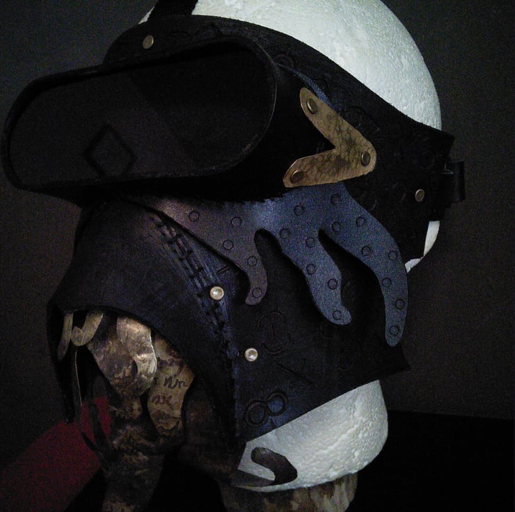 Handmade in thick black leather, the leather is distressed and branded with mythical symbols (r'lyehian for the Cthulhu fans) the text translates as exerts from the poem "the kraken wakes") The tenticle parts are textured, hammered and etched brass. The lense is acrylic, the final piece will have a tinted lense. The strap is fully adjustable, one size fits all.