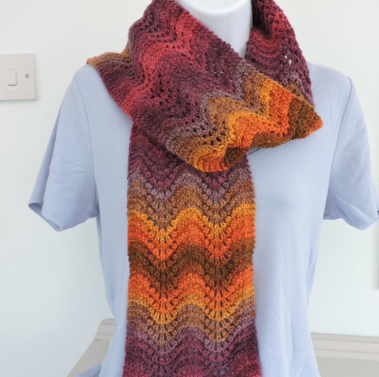 I've knitted this colourful scarf in a multi tonal graduated colour double knit acrylic and wool yarn. Lovely autumn colours of magenta, russet, mustard, taupe and purple. Beautifully soft and warm.