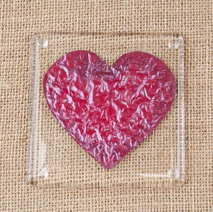 Beautiful heart coasters, perfect as a gift for someone you love, be it friend or family. Each coaster has been handmade using clear glass with hand-cut copper foil hearts fused within. The copper oxidises inside the kiln resulting in a gorgeous red/crimson tone. This reaction is completely unpredictable so sometimes a hint of blue is present as well.