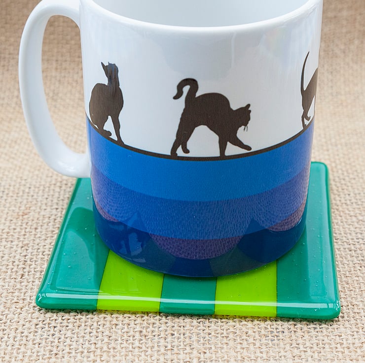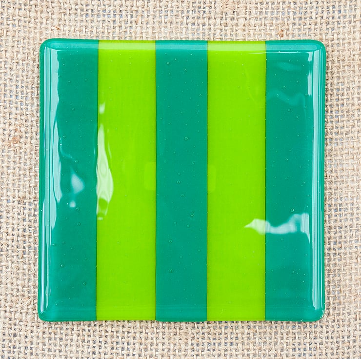 Two summery green striped coasters, perfect for a splash of colour in your living room or dining room! Each stripe has been cut by hand and then stacked onto a piece of clear glass, they're then fired in a kiln to melt all the layers together.