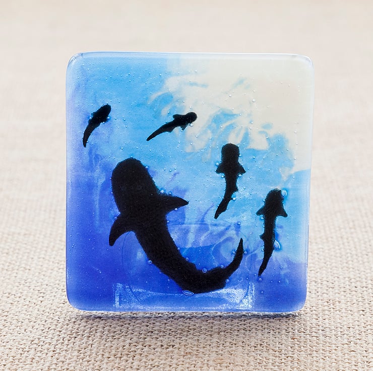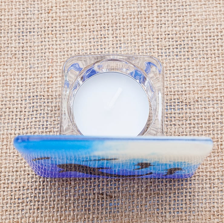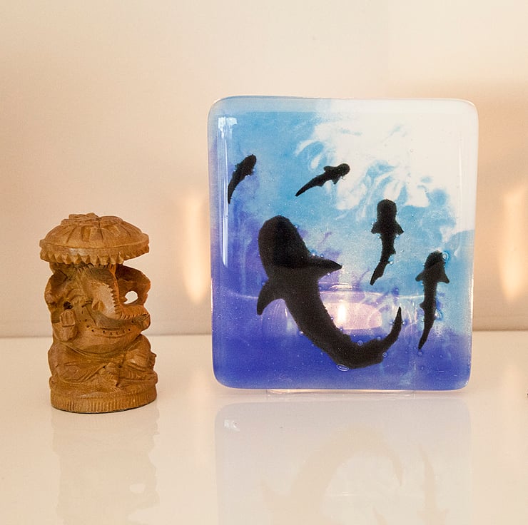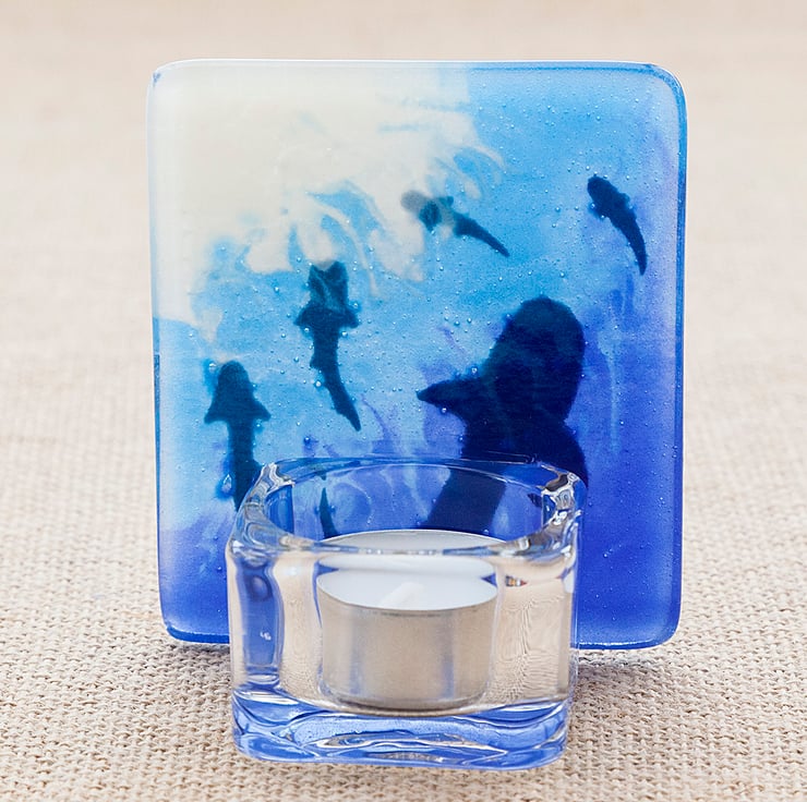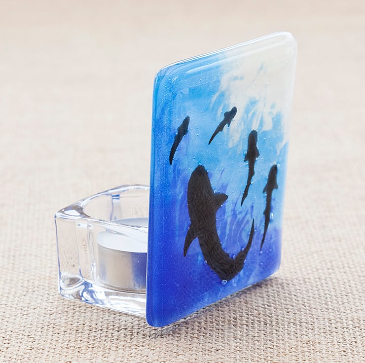 The black shark silhouettes have been handpainted and then powdered glass has been used to get the background colours and gradients. A glass tea light holder has been securely glued to the back and a small white tea light is included.