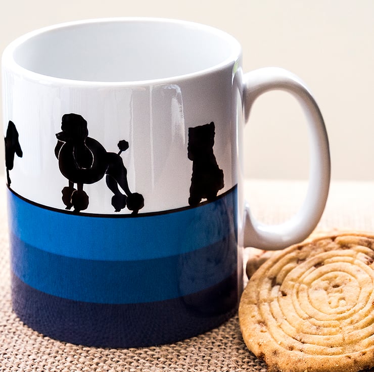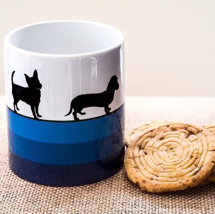 A lovely ceramic coffee mug that would make a perfect gift for any dog lover. it shows silhouettes of popular breeds of dog - dachshund, terrier, Westie, poodle. The bright blue stripes add a splash of colour.