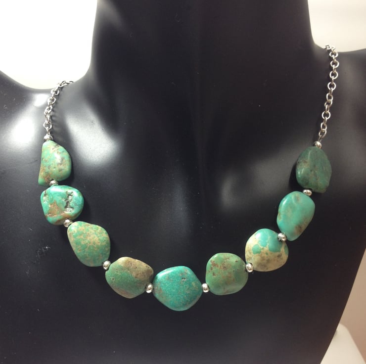 I have used 9 turquoise beads with a solid silver bead between each for drape and added a silver chain.