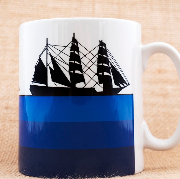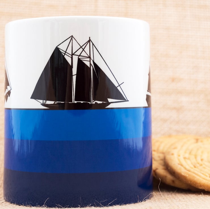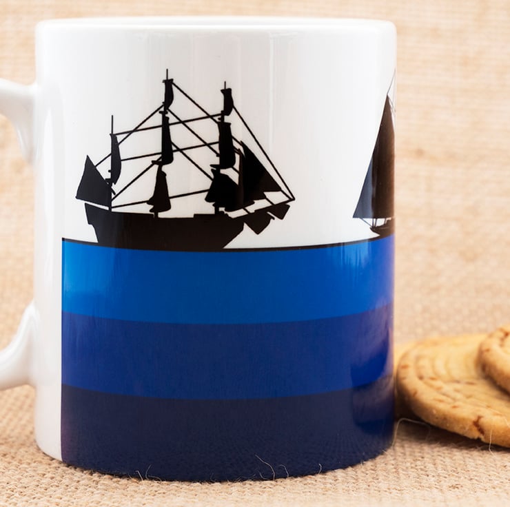 A unique coffee mug for any sailing enthusiast! The silhouettes show three types of tall ship with different rigging and the bright blue stripes add that watery feeling!