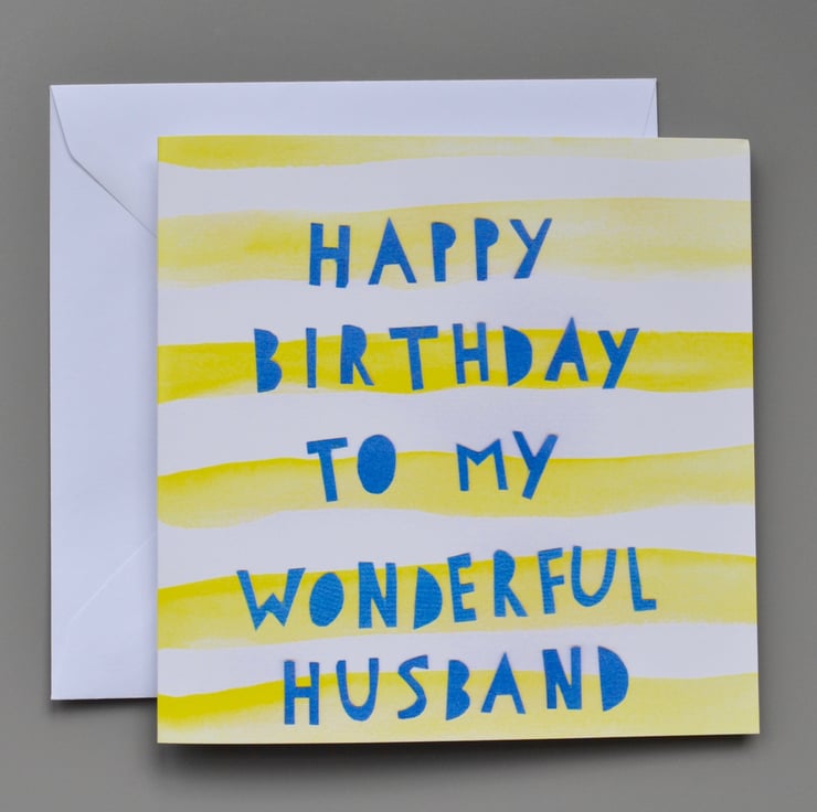 This birthday card has a background of cheerful yellow watercolour stripes and bold blue text simply saying 'happy birthday to my wonderful husband'. The background was handpainted and the lettering cut from paper by hand, and then digitally reproduced.