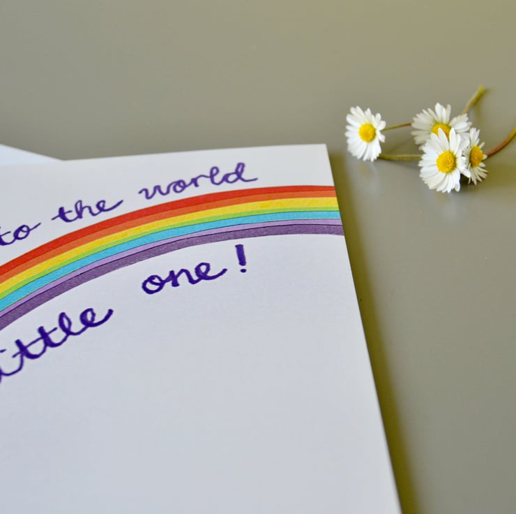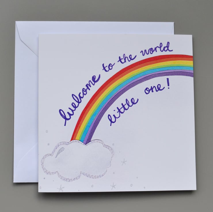 This sweet gender neutral new baby card has a colourful rainbow and silvery cloud. Hand written text in purple says 'welcome to the world, little one!'. There are a few subtle hand-drawn details in silver pen.