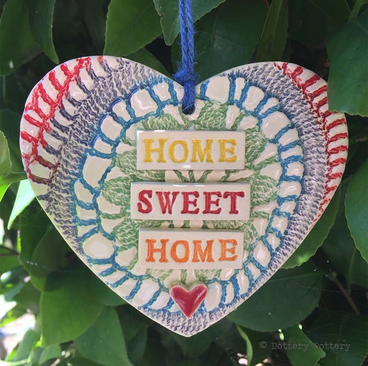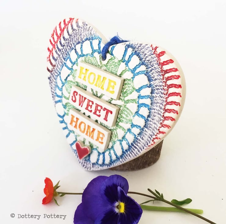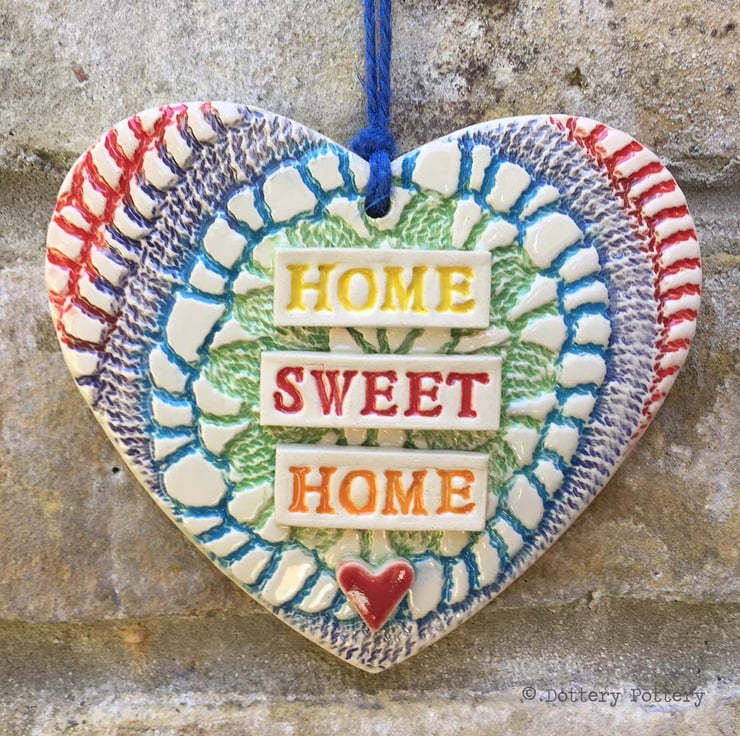 This ceramic Home Sweet Home heart is made from white earthenware clay, imprinted with pattern and colour and finished with a clear, glossy glaze. It has been fired twice, once to the bisque stage and then a second firing for the glaze. It measures 10 centimetres wide and the same in height x 5mm thick. It has a tie dye effect pattern and would be great for a festival lover. It can be hung outside.