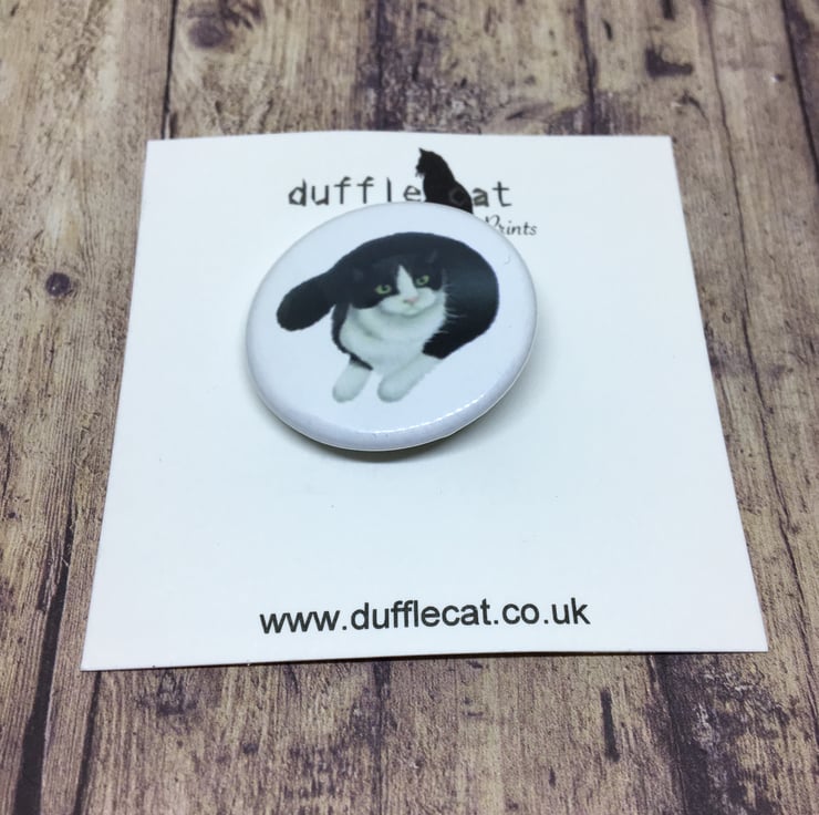 A Black and White Cat badge. Standard, 3cm (1.25") round badge, Covered with scratch and UV-resistant Mylar. Metal and plastic. With a steel pin back.