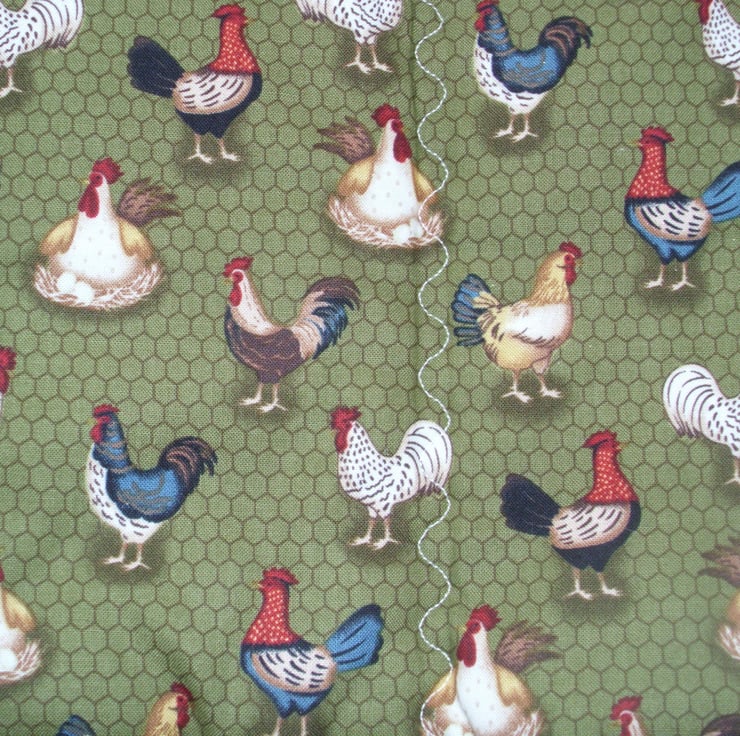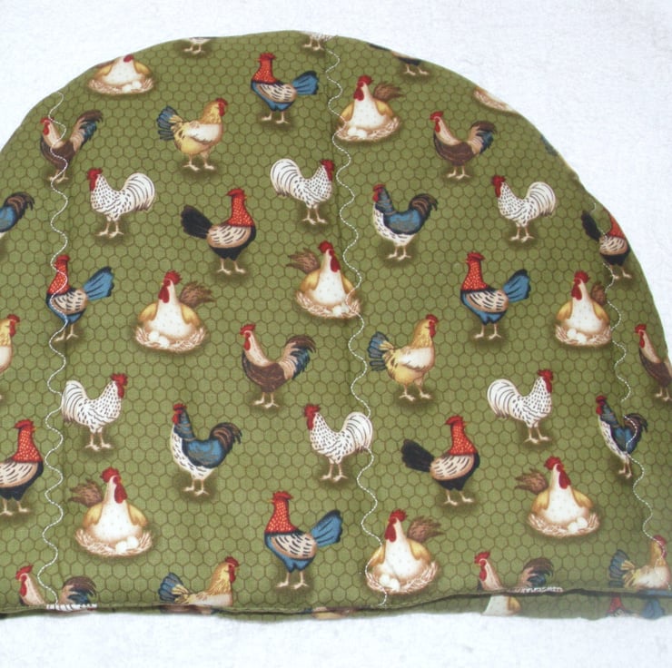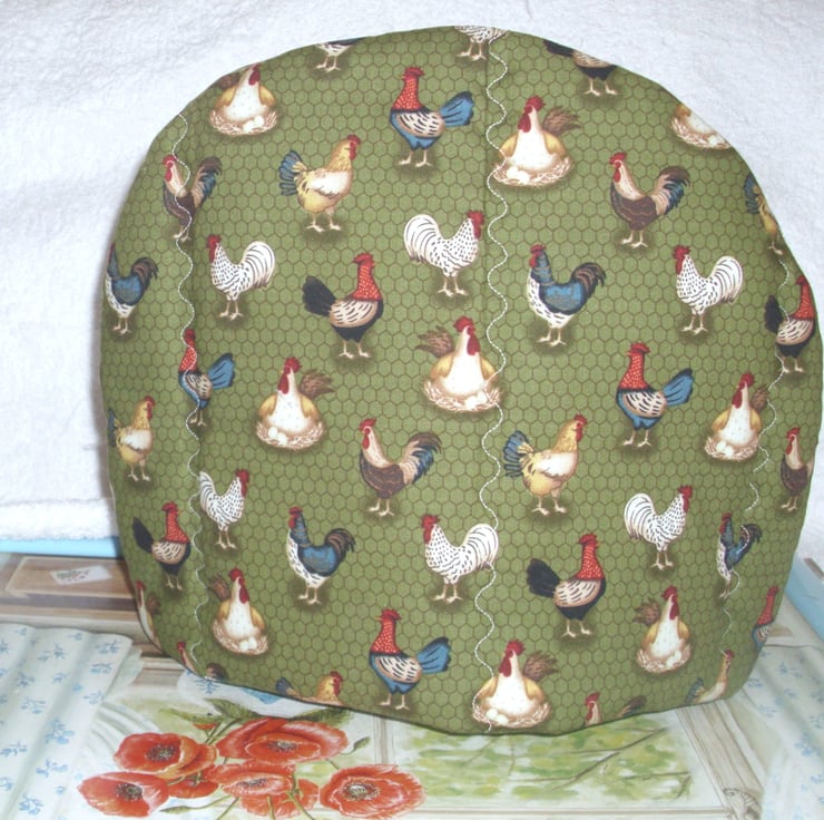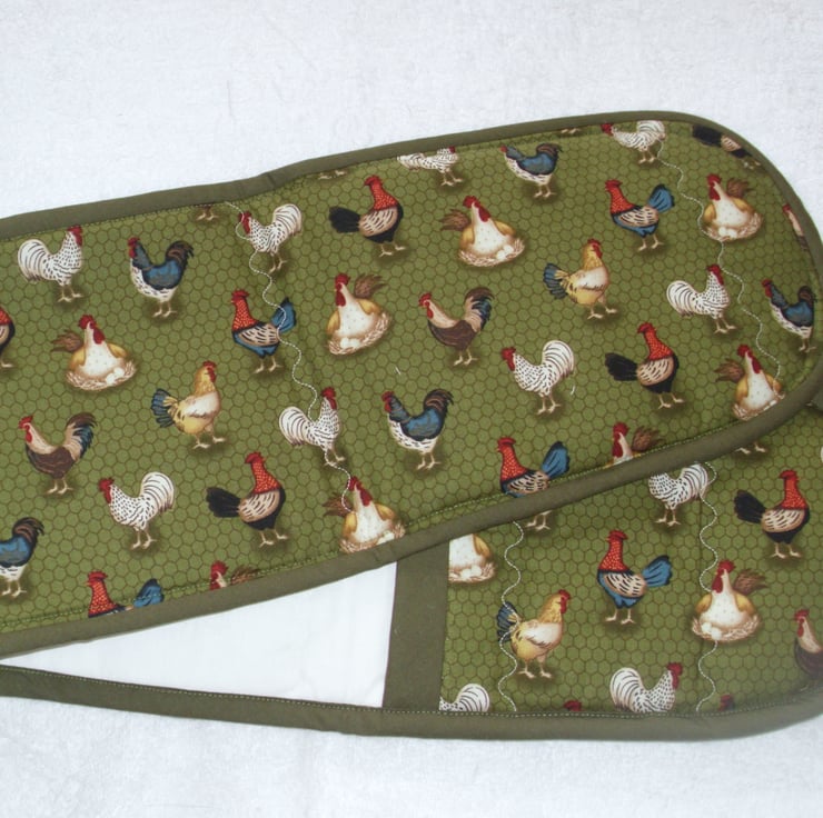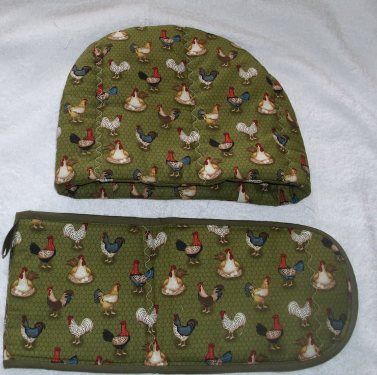 On the Farm chickens tea cosy and ovengloves with all kinds of fancy chickens on a green background.