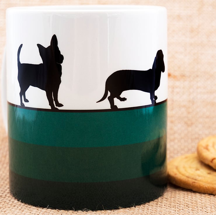 A lovely ceramic coffee mug that would make a perfect gift for any dog lover. it shows silhouettes of popular breeds of dog - dachshund, terrier, Westie, poodle. The bright green stripes add a splash of colour.