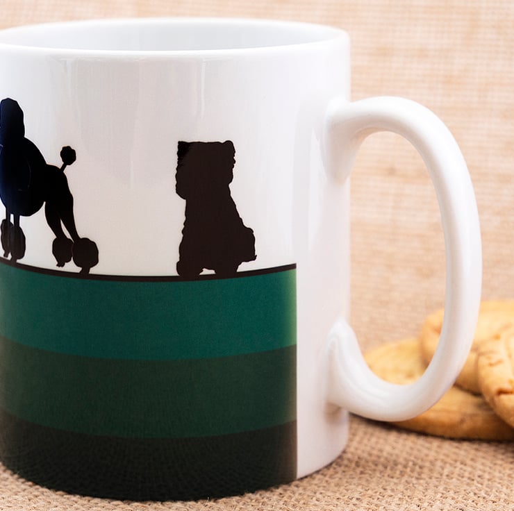A lovely ceramic coffee mug that would make a perfect gift for any dog lover. it shows silhouettes of popular breeds of dog - dachshund, terrier, Westie, poodle. The bright green stripes add a splash of colour.