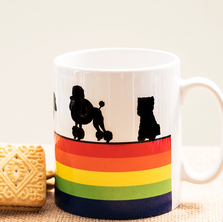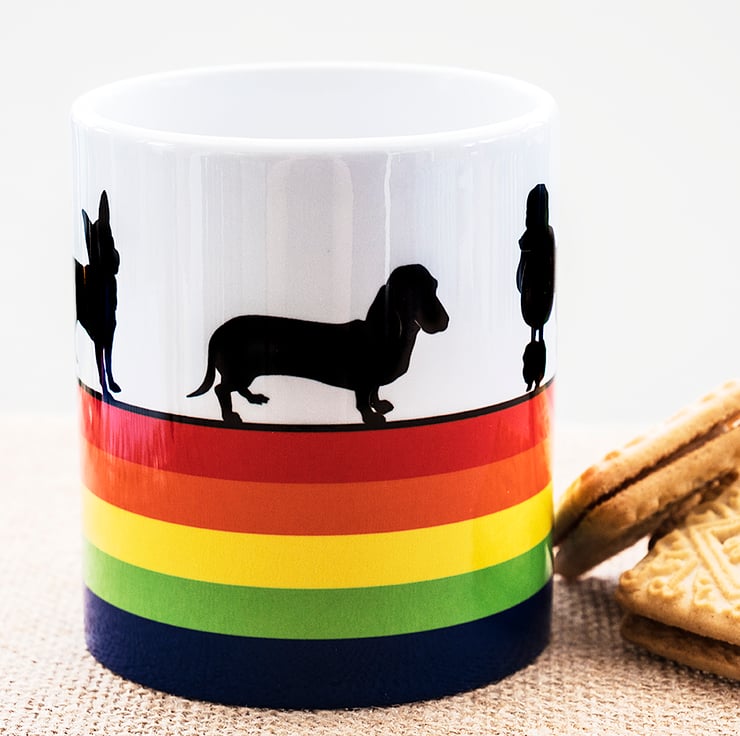 A lovely ceramic coffee mug that would make a perfect gift for any dog lover. it shows silhouettes of popular breeds of dog - dachshund, terrier, Westie, poodle. The bright rainbow stripes add a splash of colour.