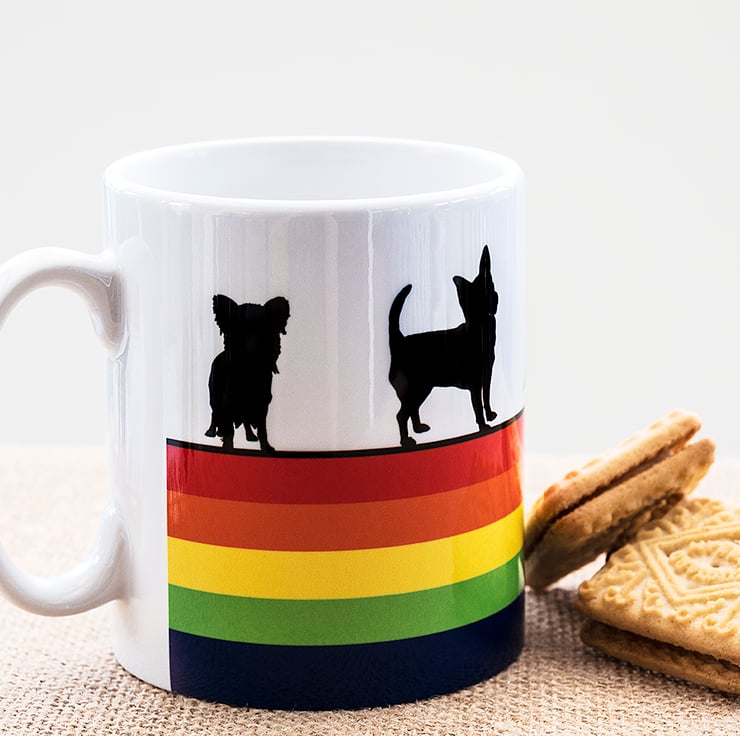 Also available is an espresso (2.5 fl.oz) mug in the same rainbow and dog design - please see my other mug listings.