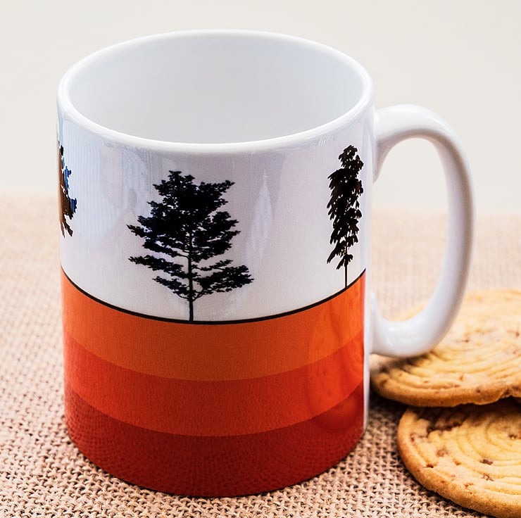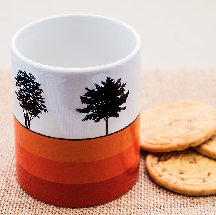 A beautiful coffee mug with silhouettes of trees on a base of colourful orange stripes. The perfect gift for any nature lover!