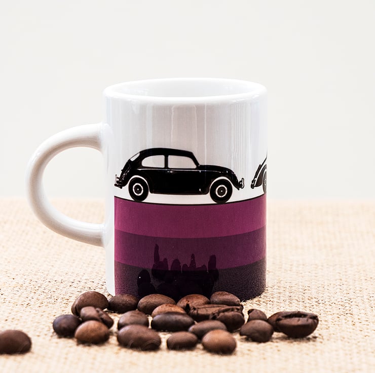 A lovely coffee mug for any car enthusiast! The mug depicts three vintage cars in silhouette and line drawing style on a base of muted purple stripes. This size is perfect as a toddler's first mug too.