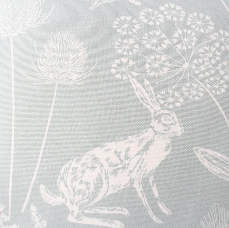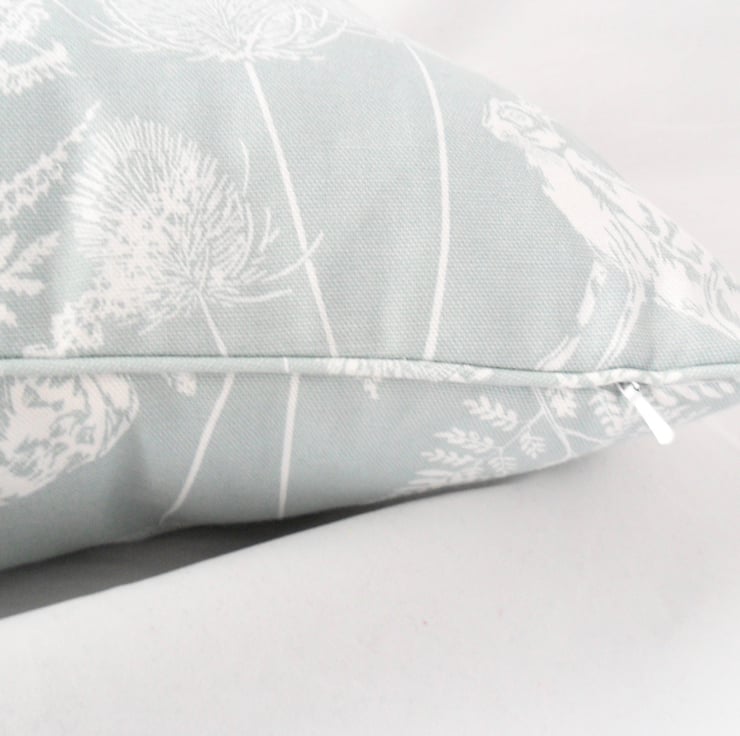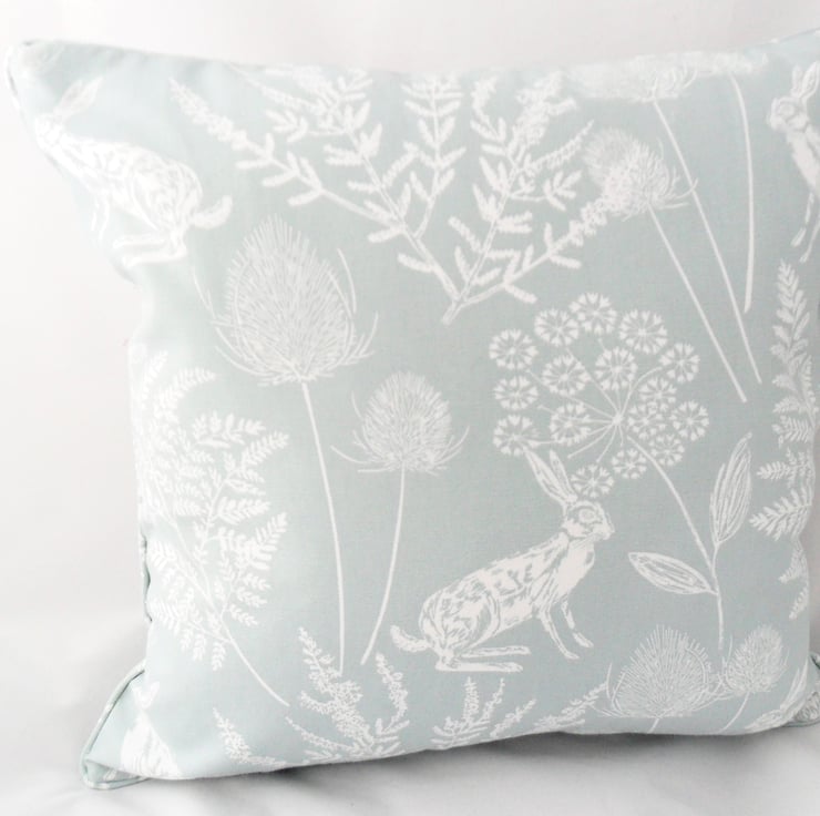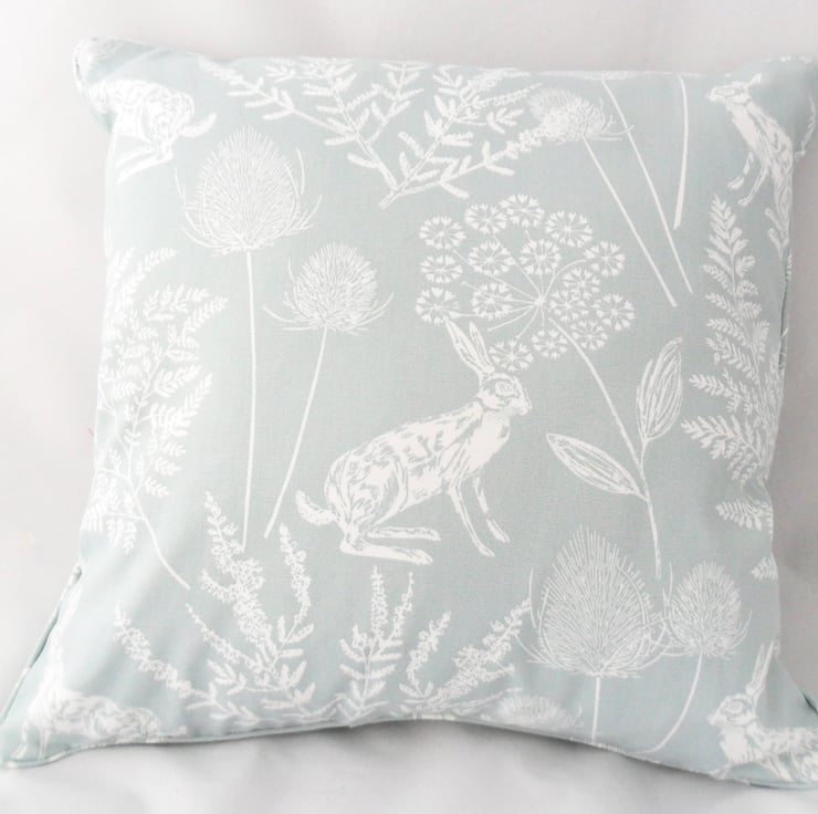 Handmade in a duck egg cotton print featuring hares and country plants, this cushion has self-piping and a concealed zip in the bottom seam. The cushion measures approximately 42 cm (16 1/2") square and comes with a 45 cm (18") polyester inner, giving it a sumptuous over- stuffed appearance. All internal seams have been bound to prevent fraying.