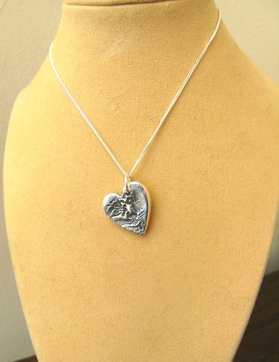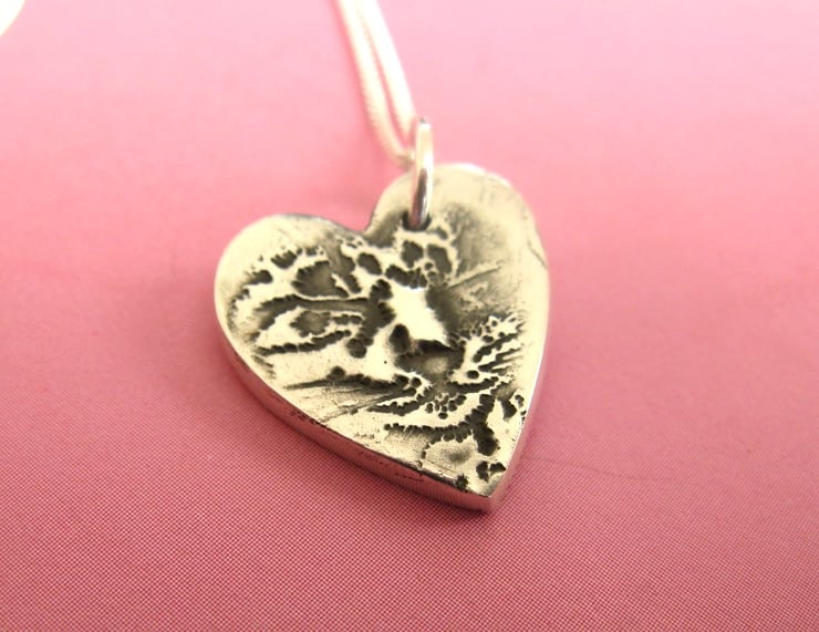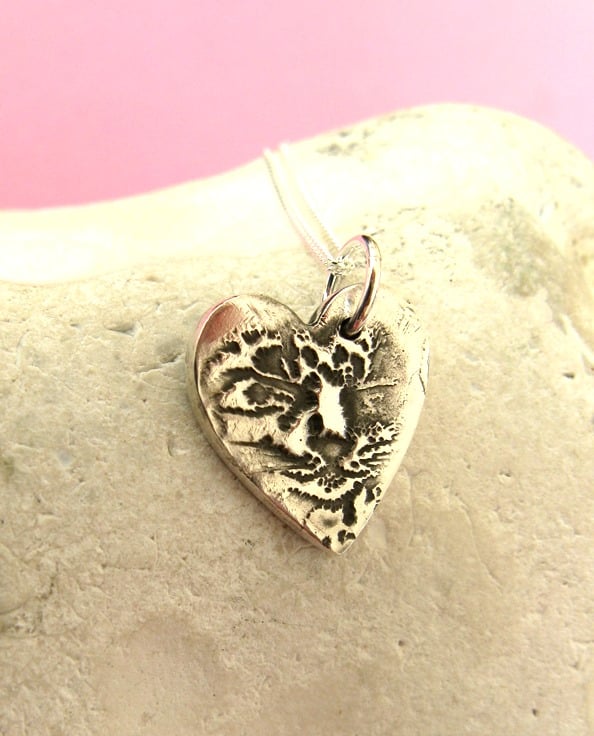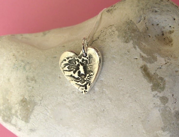 I created this necklace by making a heart pendant from recycled fine silver (pure silver). I then impressed the cat's face onto the surface and highlighted the image using a vintage silver patina effect.