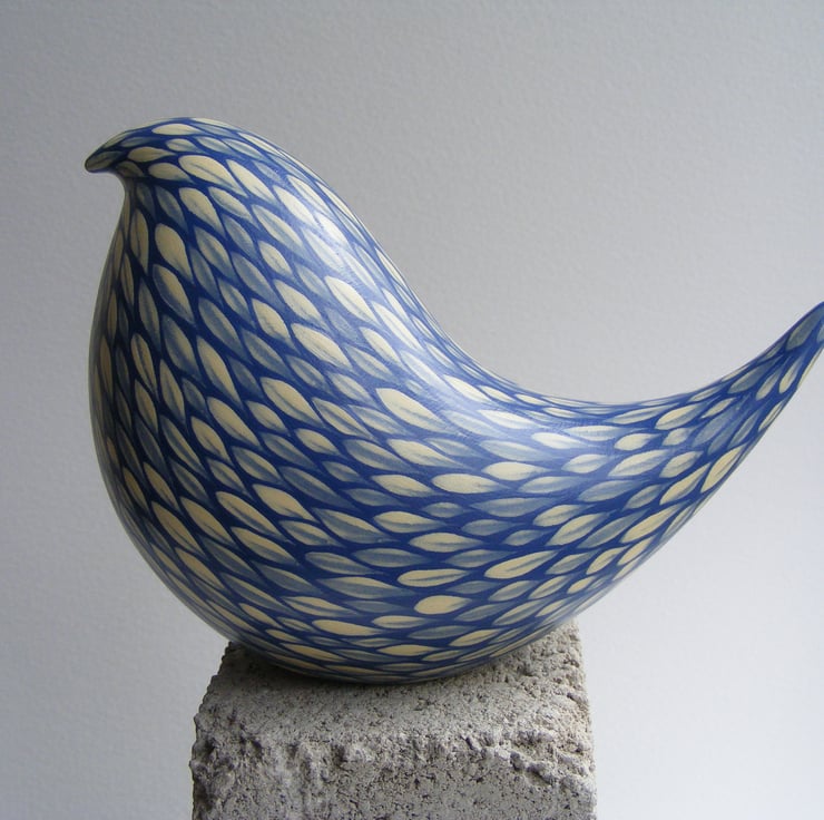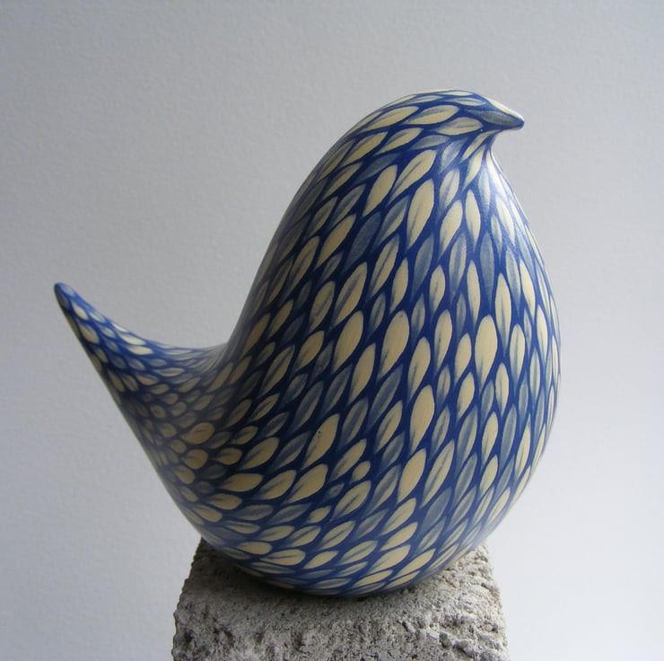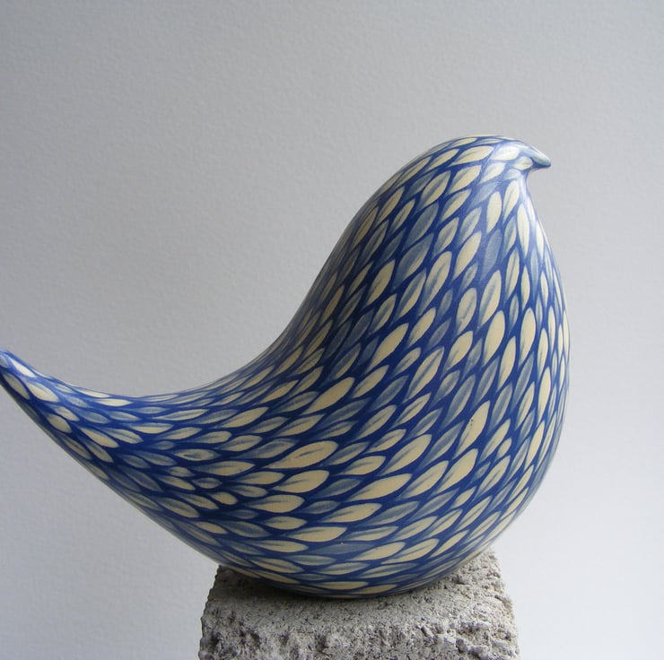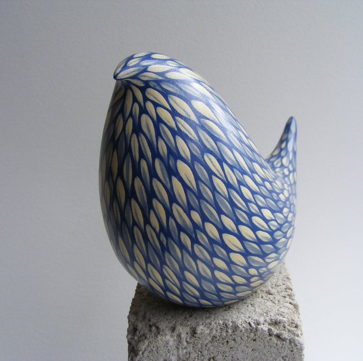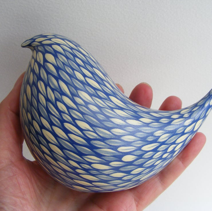 This lovely painted bird measures 9.5cm high, 12.5cm long and 6cm wide. To make it I first modelled a shape then made a mould from it. I then cast it with white earthenware clay and fire it to 1060 degrees. After firing I paint it, cream on a 'Copenhagen blue' colour background, each feather mark is a single brush stroke, it is then varnished twice to protect the decoration.