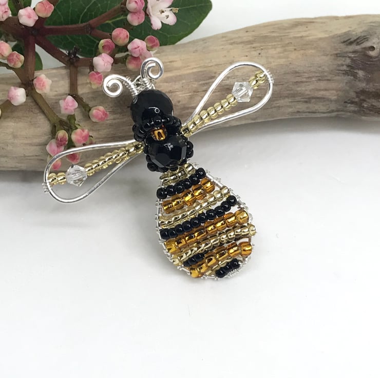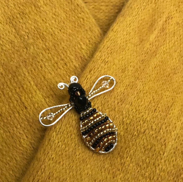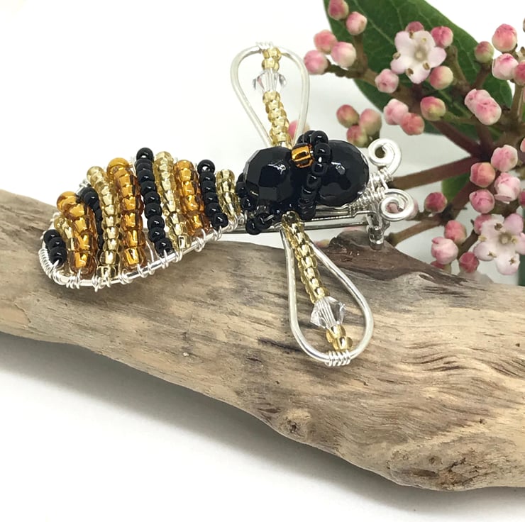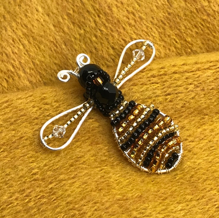 This wirework Bee brooch is made with silver filled copper wire, crystal beads and seed beads in black, golden yellow and bronze. I have formed the wire into a bee shape and gently hammered to strengthen. Using .4mm wire I have wrapped and weaved the beads in and around the bee. I have attached the bee shape to a silver coloured brooch back with safety catch.