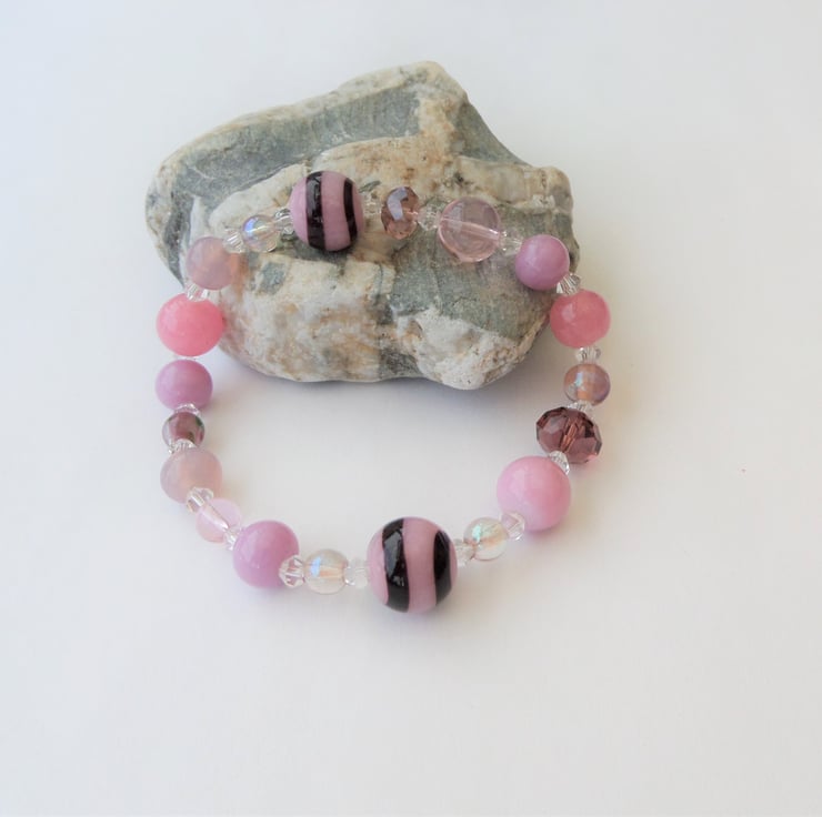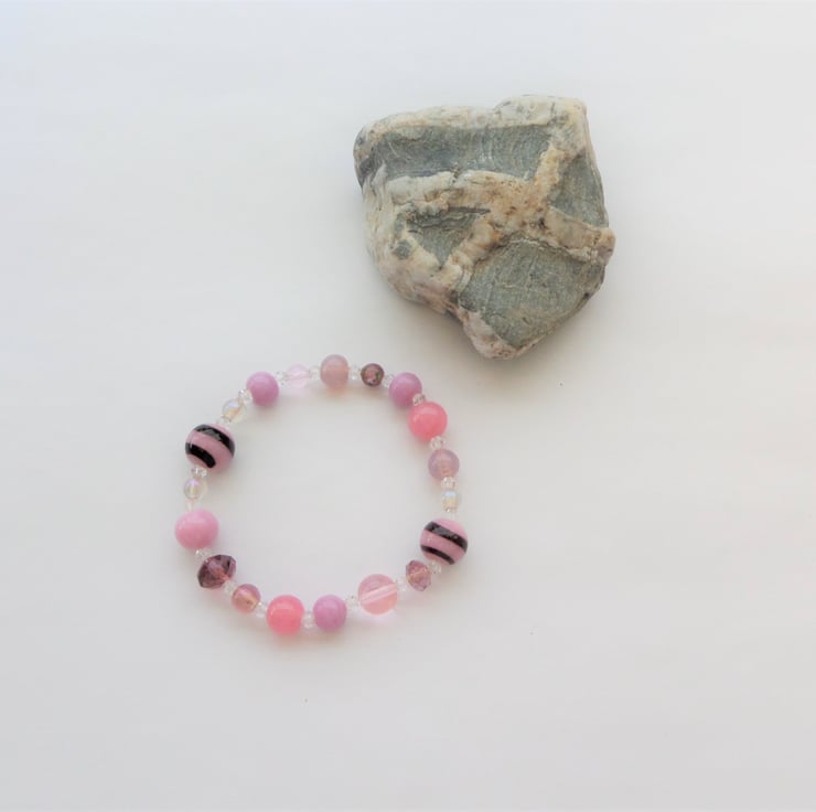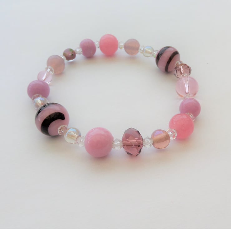 Elasticated bracelet made using a mixture of crystal and lampwork beads in shades of pink and lilac with small clear crystal spacers beads to add a bit of sparkle. Measures approx. 7.5 inches.