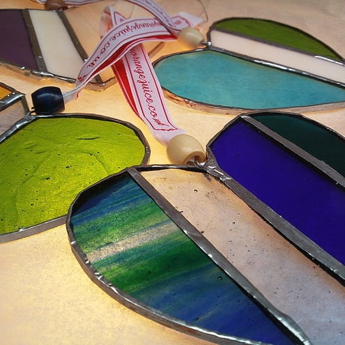 Lovely stained glass stripey hearts, each one different. Hung with silky thread and contrasting vintage and recycled beads. Please let me know if you have a particular colour choice, each one is in a different colour combination and can be personalised with a name/word painted on if so desired.