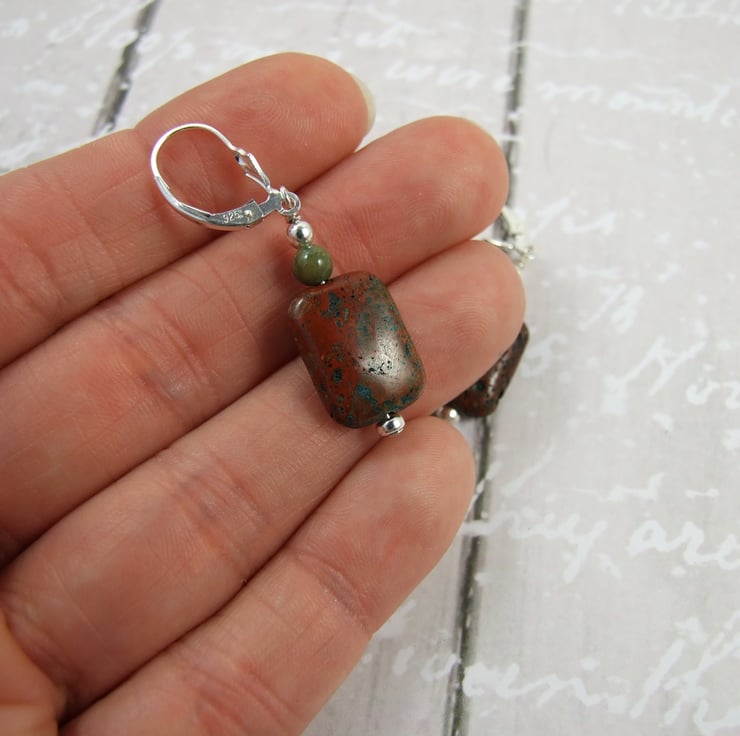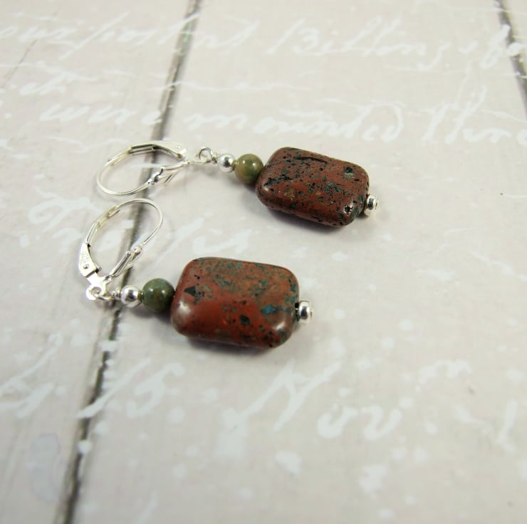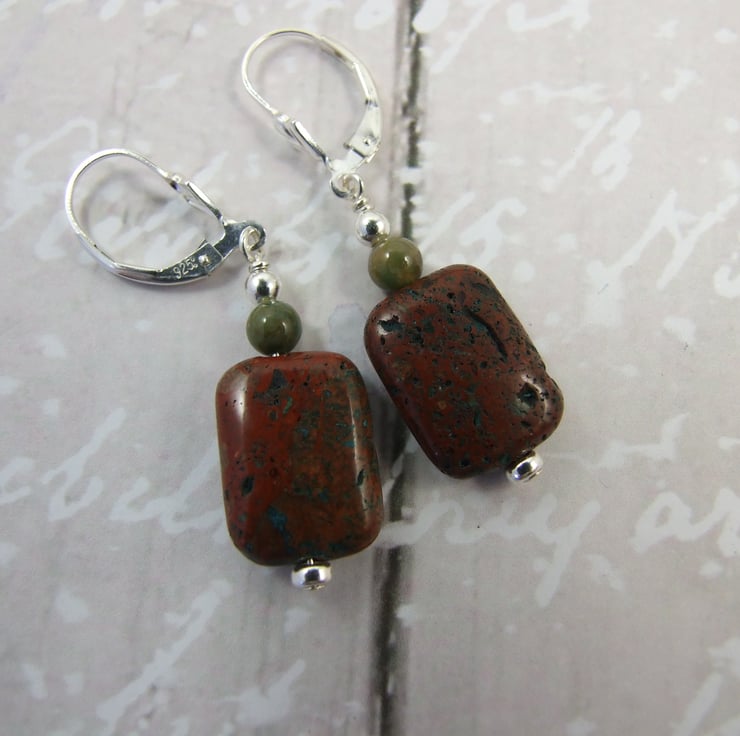 Ocean Japser Dropper Earrings. Sterling Silver with Blue Green and Red Ochre Jasper Beads.