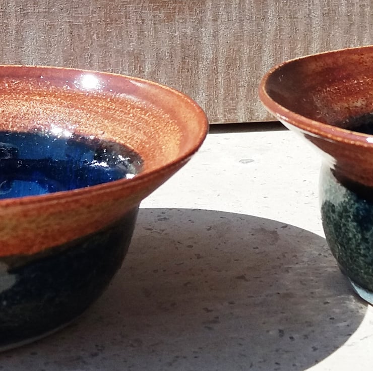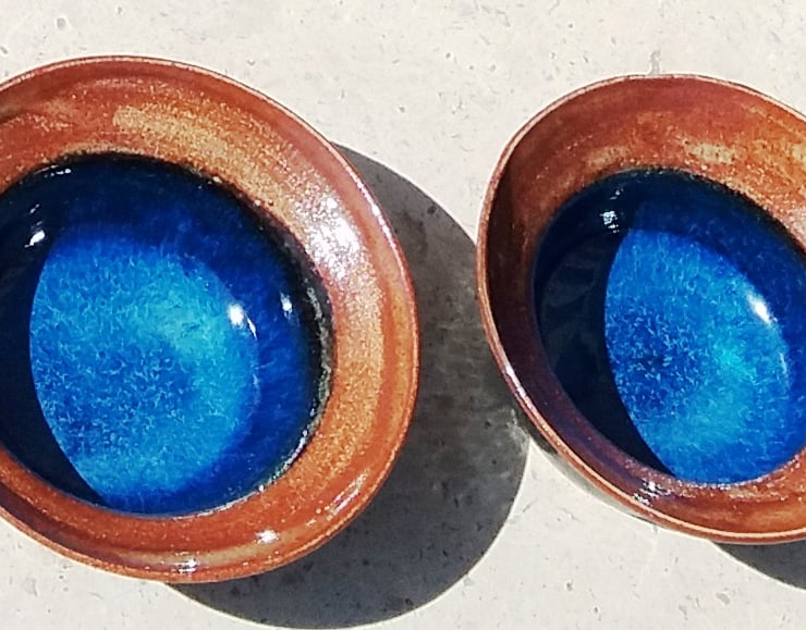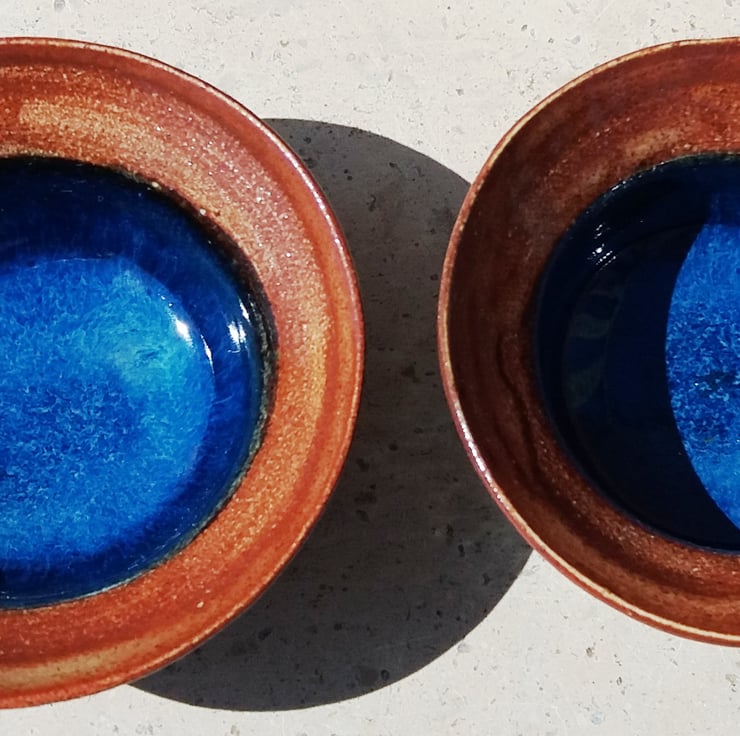 The inside is glazed in a rich deep shiny blue and the rim is a glossy rust brown.