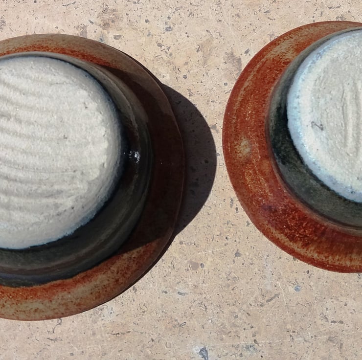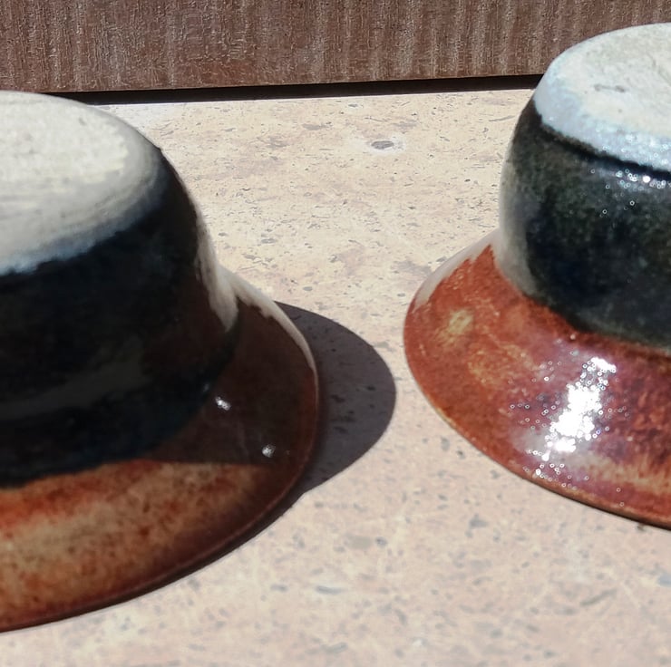A nest of two wide rimmed small and beautiful bowls that fit into one another for storage yet each provide the same volume to fill.