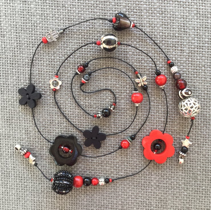 Lariat necklace featuring a glorious mixture of black and red beads including wood flowers, gorgeous wood, glass and miracle beads, and Tibetan antique silver beads and charms, including a, butterfly, flowers and a hamsa hand, all strung on a waxed linen thread.