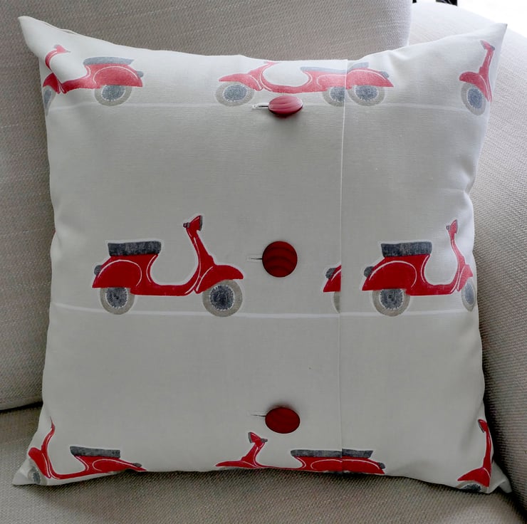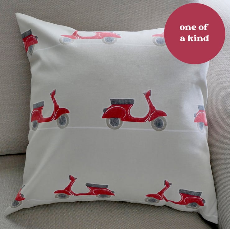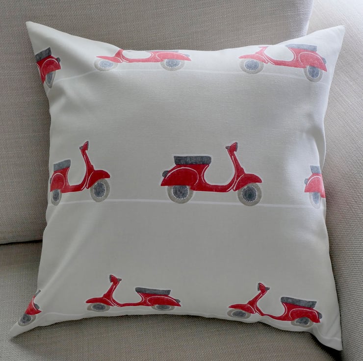 This lovely handmade cushion (pillow) is the perfect choice for anyone who loves scooters, particularly the iconic Italian Vespa and Lambretta.