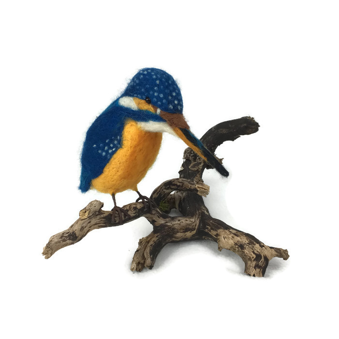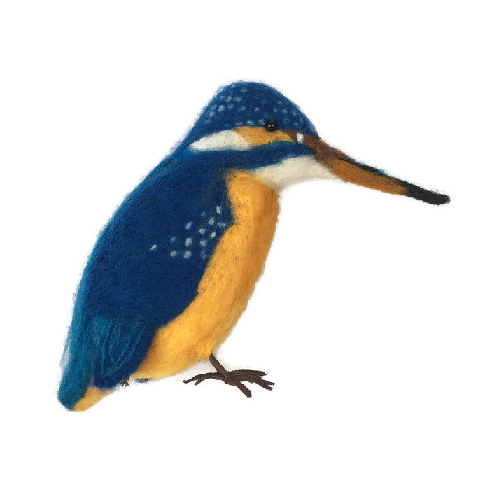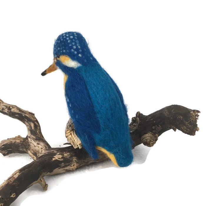 This kingfisher has been needle felted using 100% wool. Woollen fibres have been felted together and shaped using a barbed felting needle. Coloured merino wool over a white core wool have been used for this kingfisher. He has acrylic half pearl flatbacks added as eyes and wired feet which can be gently shaped in order for him to perch on a branch if desired.