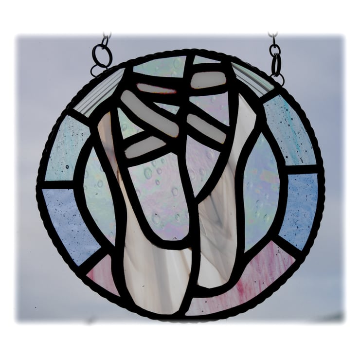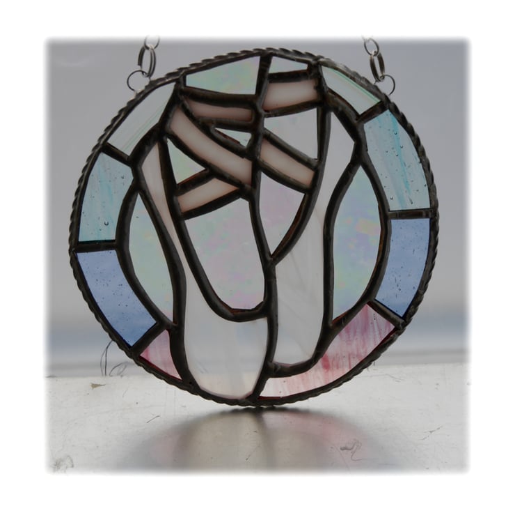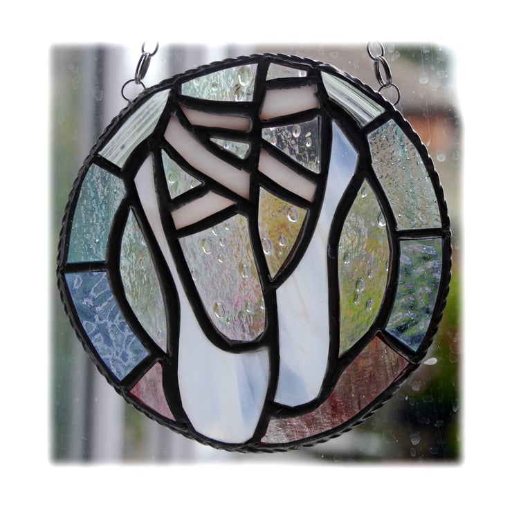 This is a pair of ballet shoes enclosed in a ring to make a very pretty window hanging.