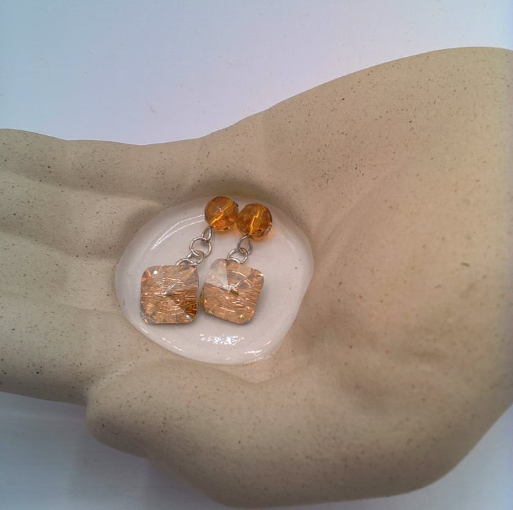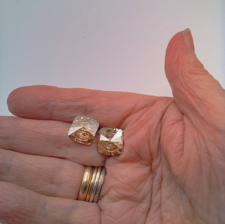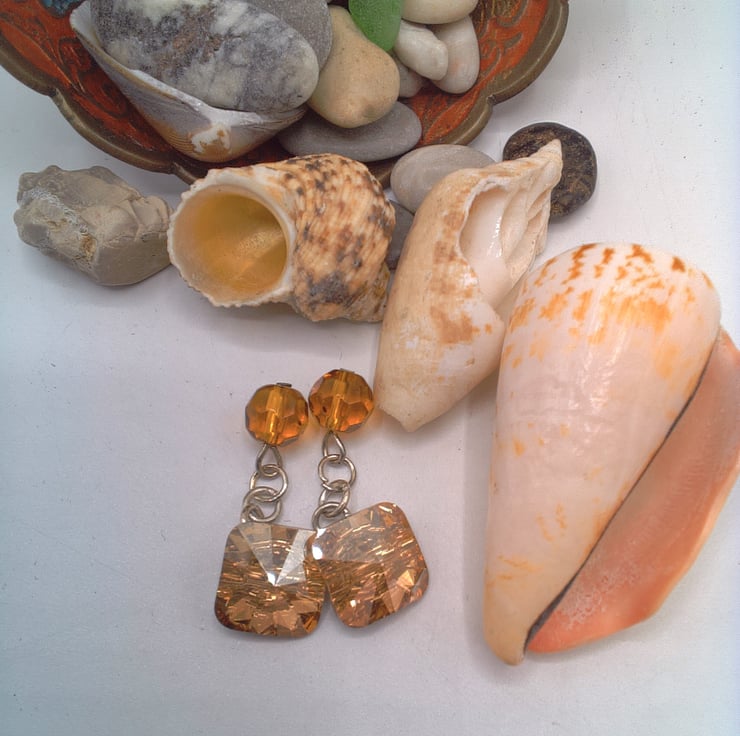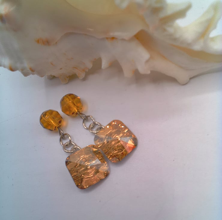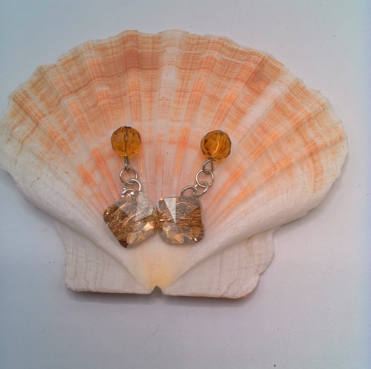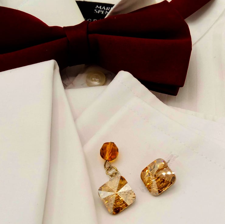 This formal pair of cuff links for either a man or lady would make an ideal Birthday, Fathers Day, Anniversary or Christmas gift for someone special. They would be the special finishing touch to any shirt for a wedding or party, or indeed for everyday wear. The cuff links are made using 12 mm square crystal elements buttons in golden shadow shade and 8 mm faceted topaz crystal beads. Both beads are held on piece of chain 10 mm long to pass through the button holes. All metal components are silver plated. The cuff links will be dispatched wrapped in tissue paper in an organza bag and delivered to you via Royal Mail first class post. As the set up of computer monitors varies the colour shade shown of these stones may vary.