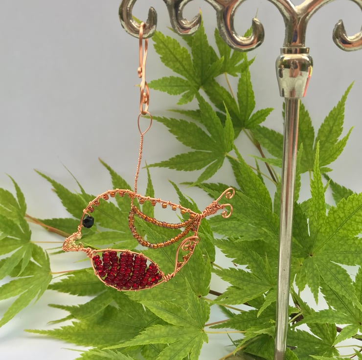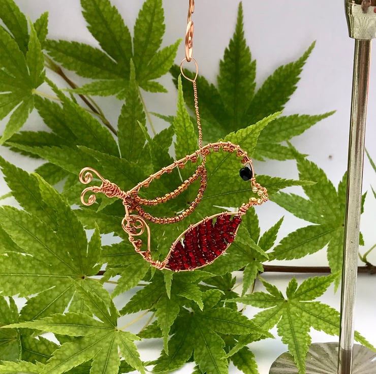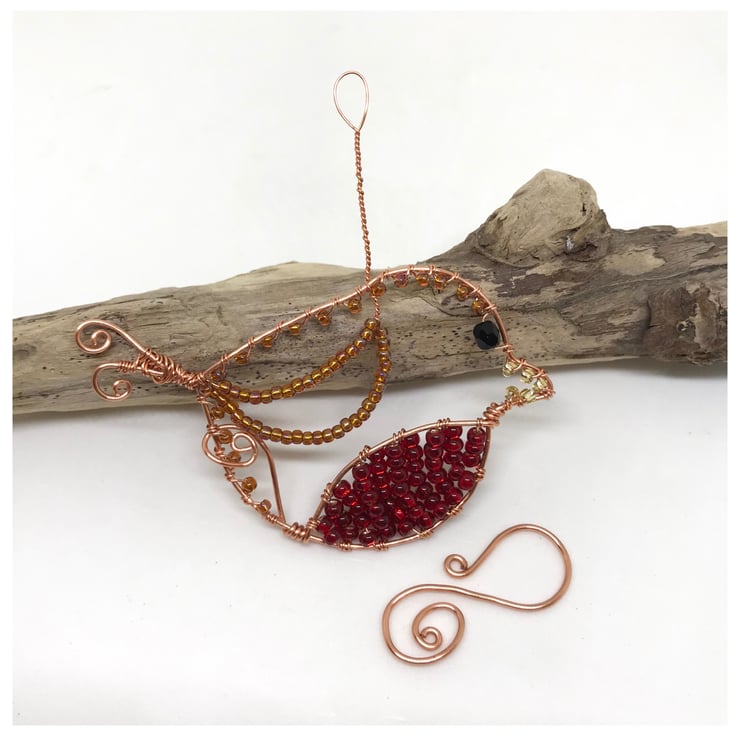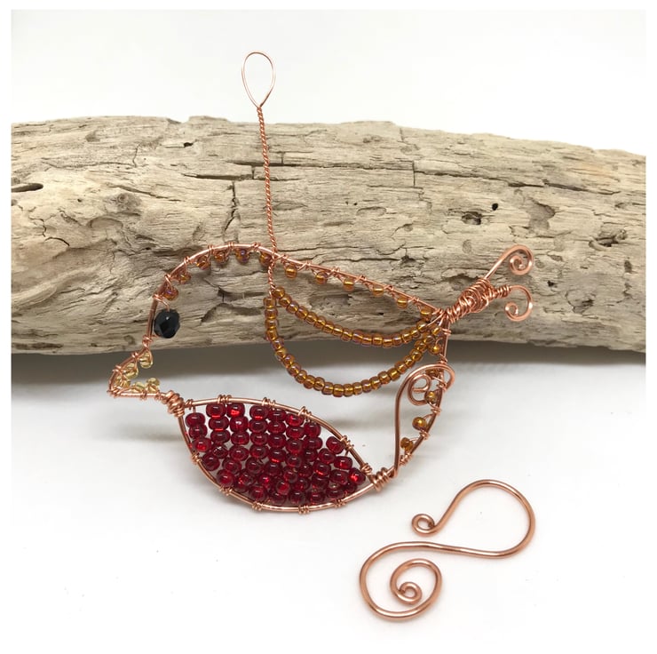 I have created this Robin with Copper wire. I have formed the wire into a bird shape and wrapped red and bronze coloured seed beads around the wire shape and a larger black bead for the eye. A copper handcrafted hook is included for hanging the Robin.