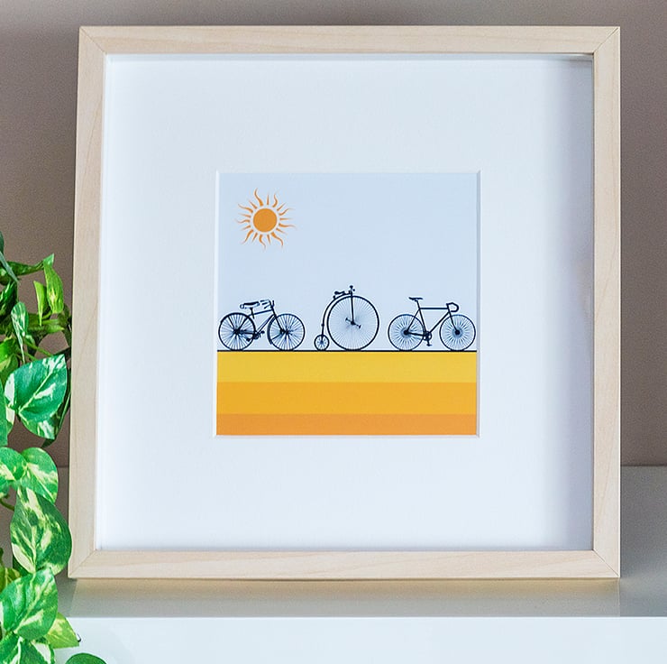 An unusual contemporary graphic print depicting three different bicycle silhouettes on simple yellow stripes in a neutral square frame. There is a penny-farthing, a tandem and a road bike. This would make the perfect gift for any cycling enthusiast or fan!