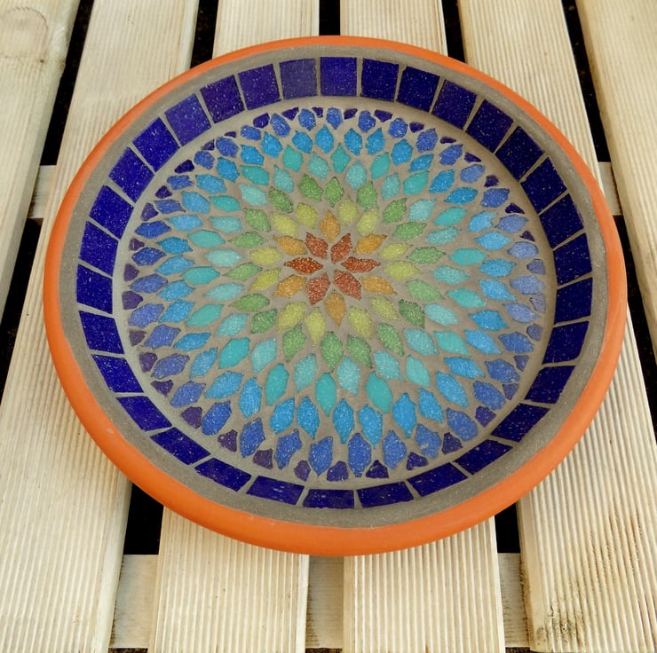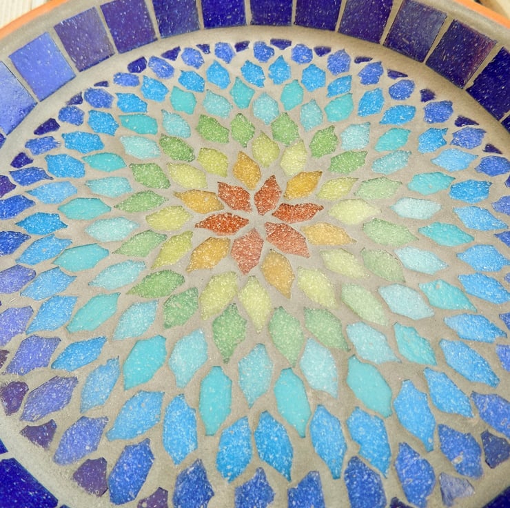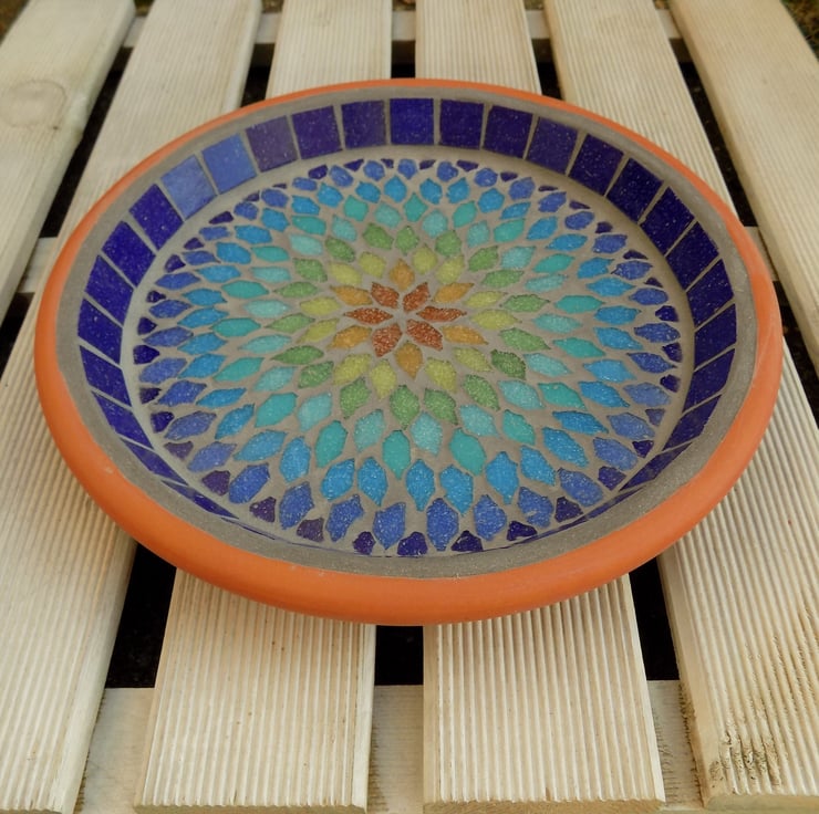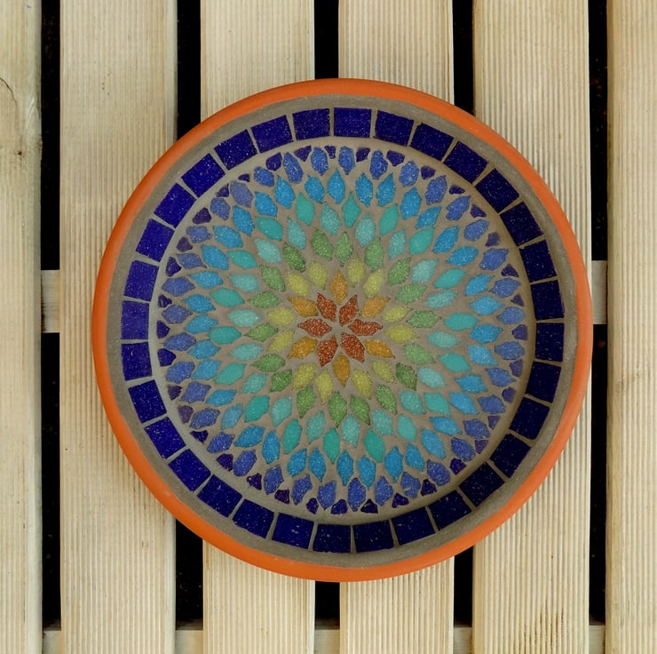 A 25cm (9.75 inch) diameter terracotta saucer with a mosaic made out of glass tiles. finished with a grey grout that is designed to repel algae and mold.