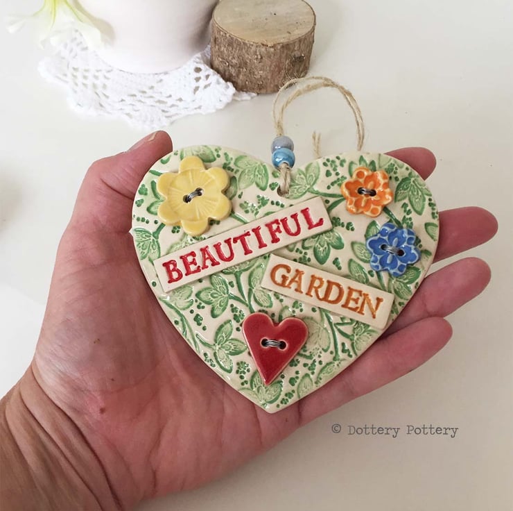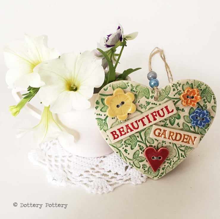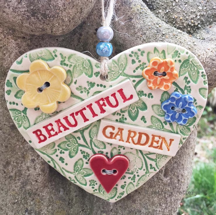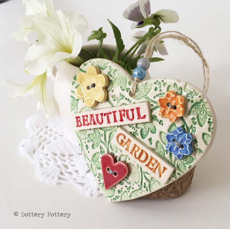 This ceramic heart is made from white earthenware clay. It has a floral theme with ceramic buttons wired onto the pottery heart with silver coloured wire.. 4" width (10 centimetres) and the same in height. Great gift for gardeners - can be hung outside.