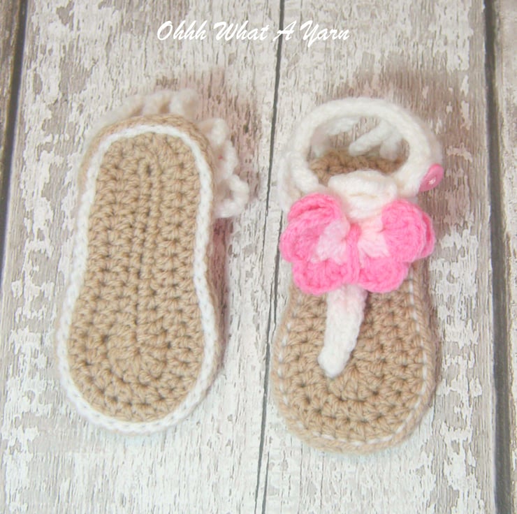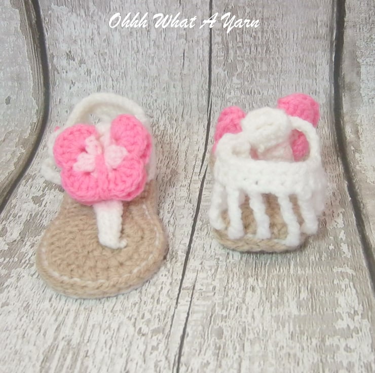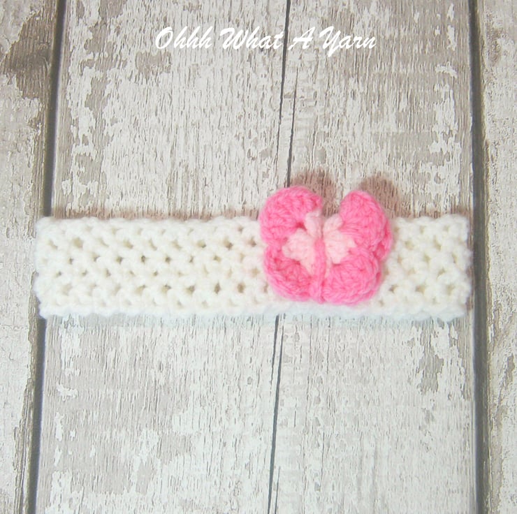 The set comprises of a pair itty bitty flip flop sandals with a decorative butterfly. The sandals fasten with a pretty buttons. The matching headband is crocheted in a lovely lattice pattern which mean it has lots of stretch. It also has a matching decorative crochet butterfly that can be worn at the front or to the side.