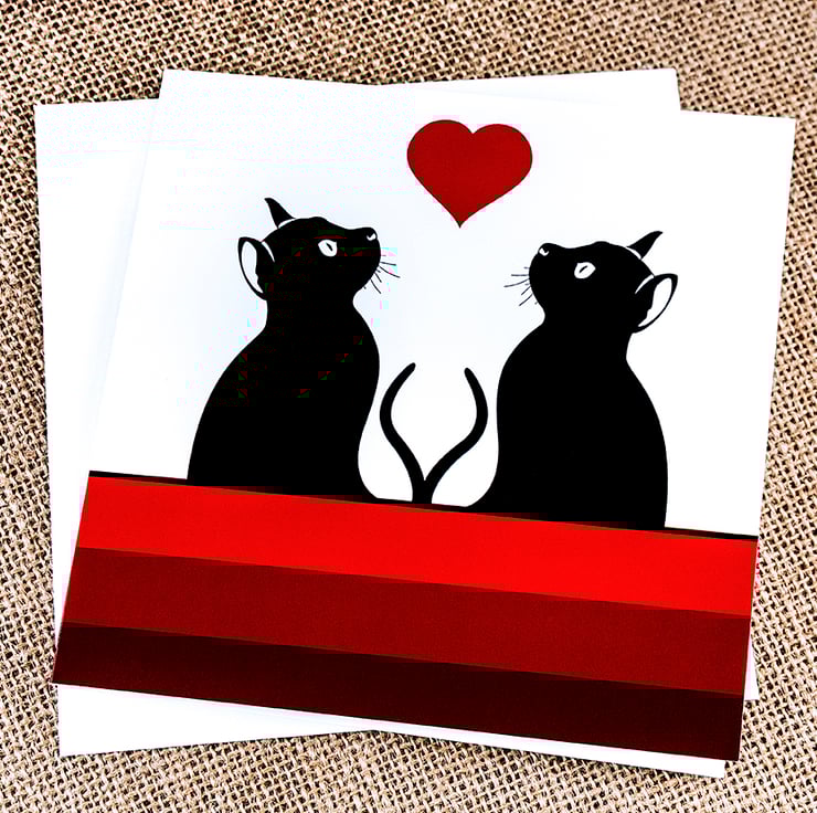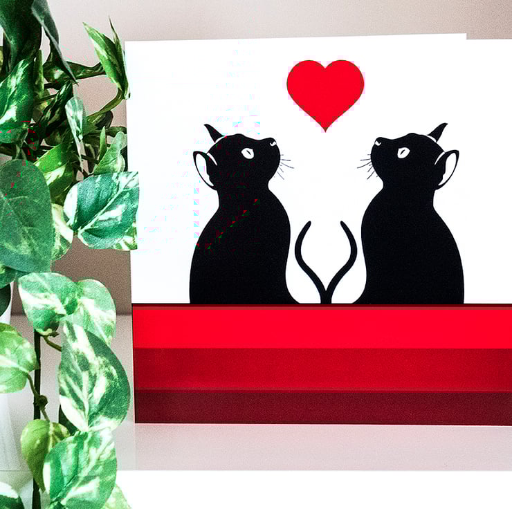 A beautiful, contemporary, graphic greetings cards to delight any cat lover on any occasion! It shows two cute cats in silhouette gazing endearingly at a red love heart. It is blank inside so would be perfect for any event - birthday, anniversary, engagement, thank you - or just because your friend loves cats!