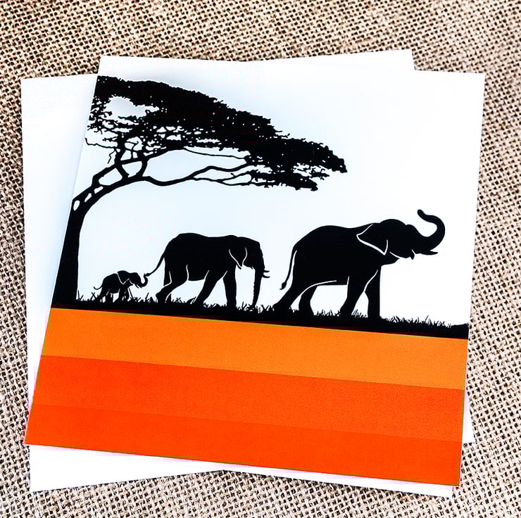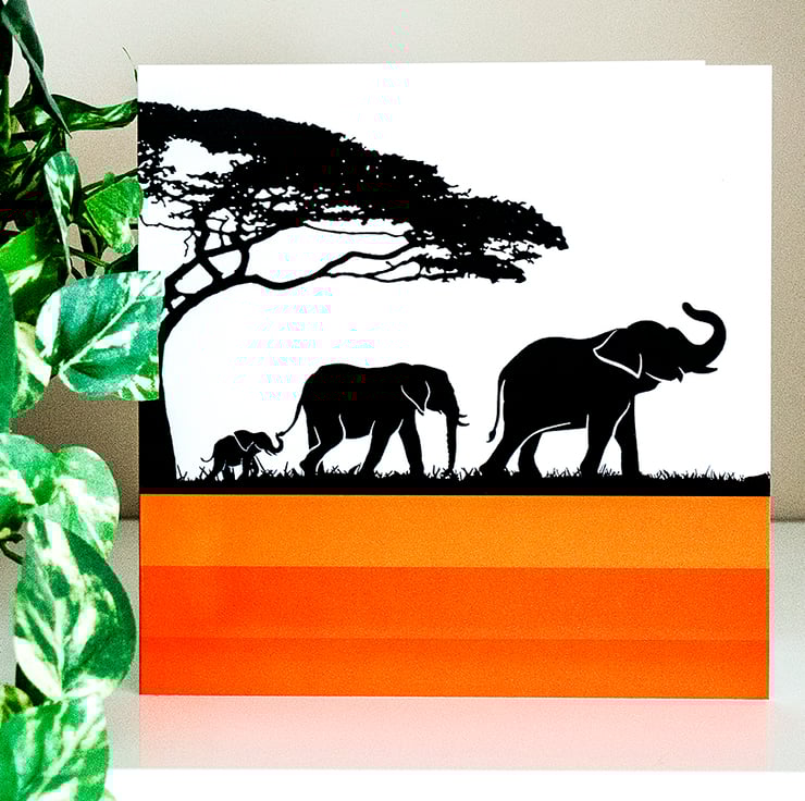 A beautiful, contemporary, graphic greetings cards to delight any elephant or animal lover on any occasion! It shows a family of elephants in silhouette on dawn patrol in the African savannah. Complete with baobab tree and bright orange stripes it really conjures up the heat of Africa!