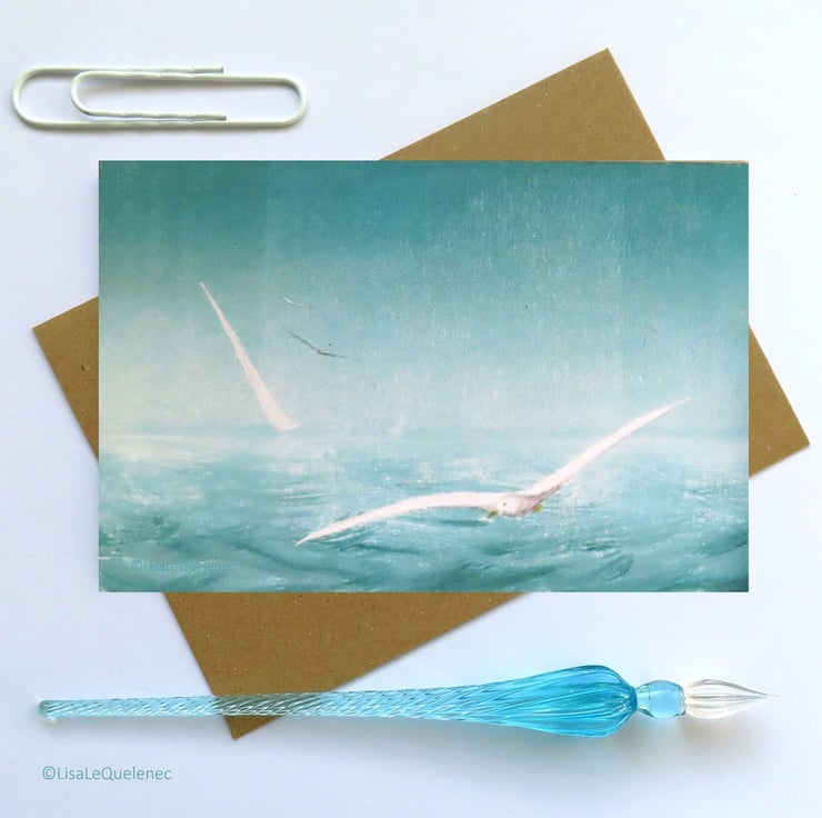 A yacht and gulls skim the breeze racing each other over choppy seas. A perfect card for the sailor and adventurer in your life.