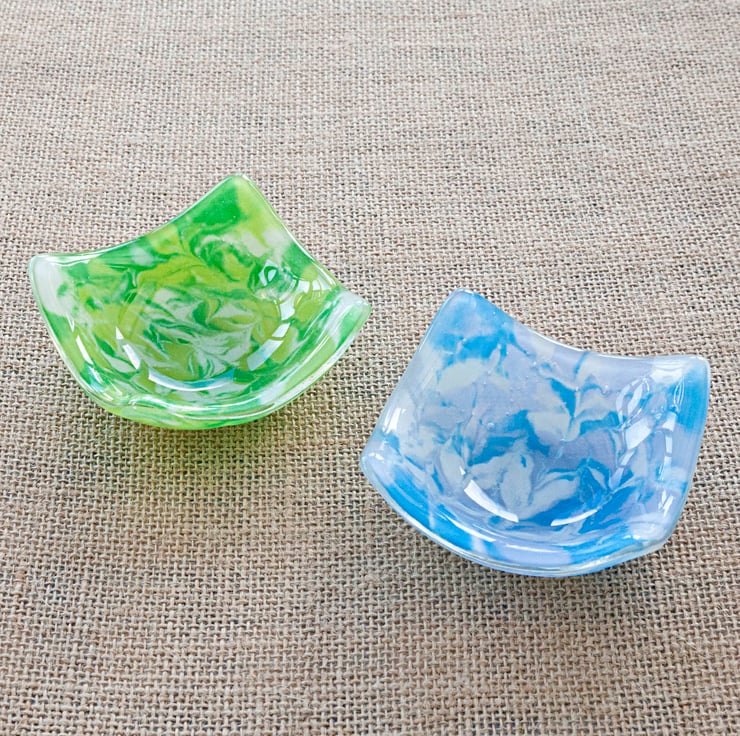 All items are handmade by myself in my home workshop, the glass is layered and then fired in a kiln in order to fuse the layers together. Because each item is handmade they will all be slightly different.