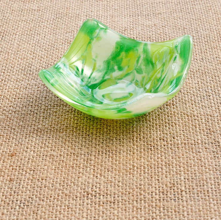 An adorable little handmade slumped glass dish with marbled colourful patterns. This dish can be used for a variety of things from dipping sauces to holding jewellery items to being a tealight holder.