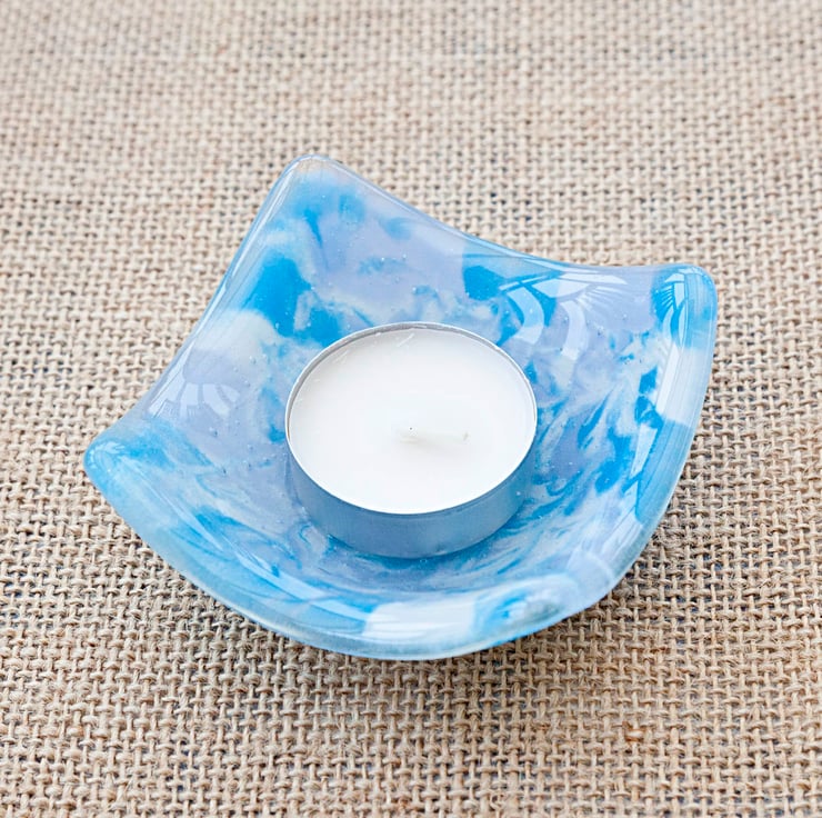 An adorable little handmade slumped glass dish with marbled colourful patterns. This dish can be used for a variety of things from dipping sauces to holding jewellery items to being a tealight holder.